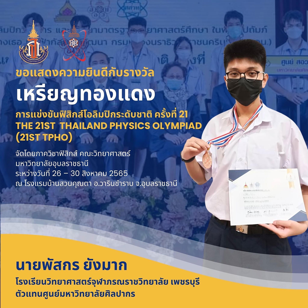 การแข่งขันฟิสิกส์โอลิมปิกระดับชาติ ครั้งที่ 21 The 21st Thailand Physics Olympiad (21st TPhO) จัดโดยภาควิชาฟิสิกส์ คณะวิทยาศาสตร์ มหาวิทยาลัยอุบลราชธานี นายพัสกร ยังมาก นักเรียนชั้นมัธยมศึกษาปีที่ 5 โรงเรียนวิทยาศาสตร์จุฬาภรณราชวิทยาลัย เพชรบุรี ได้รับรางวัล เหรียญทองแดง ระดับชาติ การแข่งขันโอลิมปิกวิชาการ สาขาฟิสิกส์ ตัวแทนศูนย์มหาวิทยาลัยศิลปากร