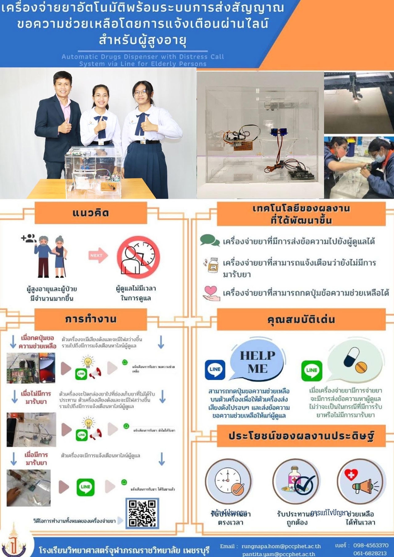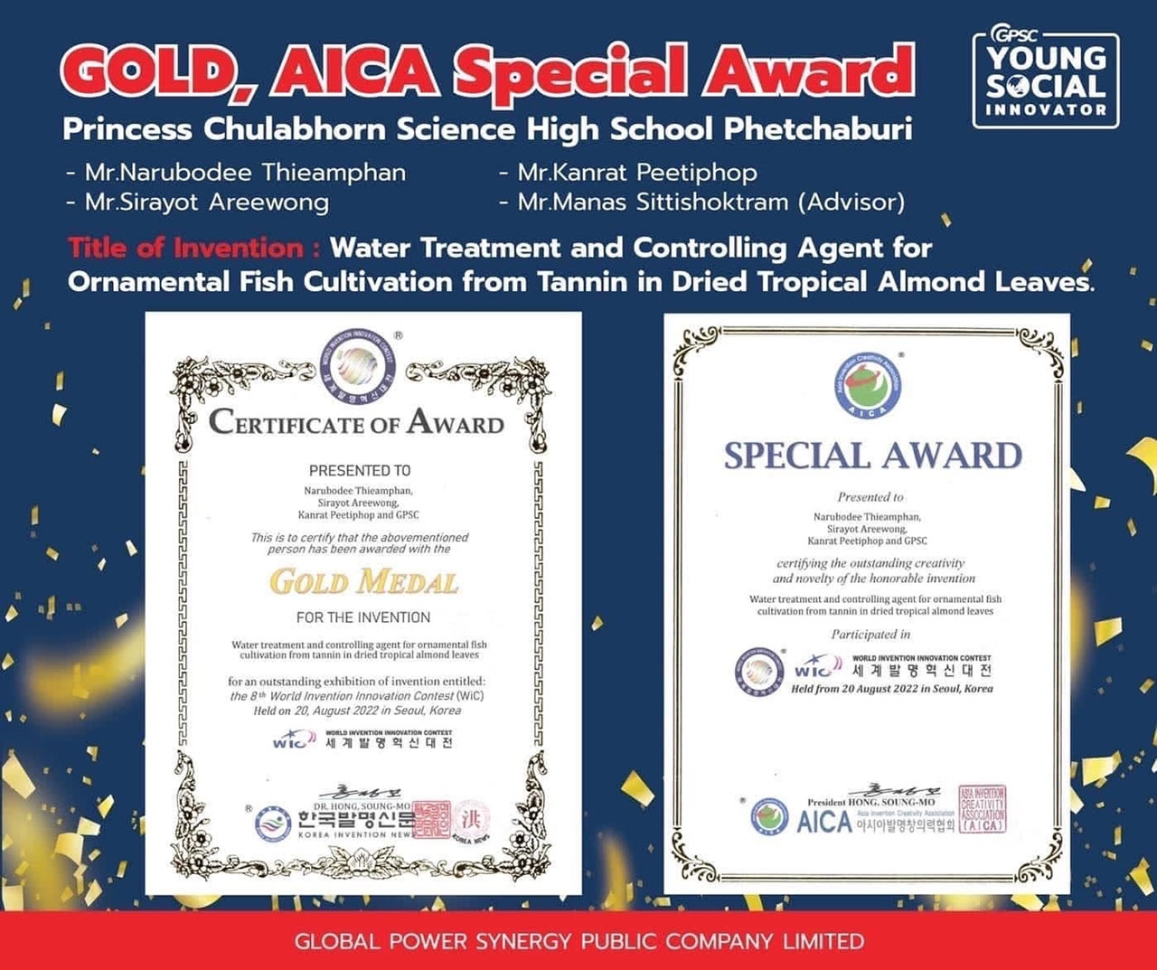 ผลงานการพัฒนาโครงงานของ นายนฤบดี เทียมพันธ์ นายสิรยศ อารีย์วงศ์ และนายการรัฐ ปีติภพ โดยมี นายมนัส สิทธิโชคธรรม เป็นคุณครูที่ปรึกษาโครงงาน ได้รับรางวัลชนะเลิศเหรียญทอง จาก GPSC Young Social Innovator 2021 หรือ GPSCYSI SS4 และ AICA Special Award จากเวที World Invention Innovation Contest หรือ WiC 2022 กรุงโซล สาธารณรัฐเกาหลี นอกจากนี้ผลงานยังอยู่ในขั้นตอนการยื่นจดอนุสิทธิบัตรผลงานกับกรมทรัพย์สินทางปัญญา