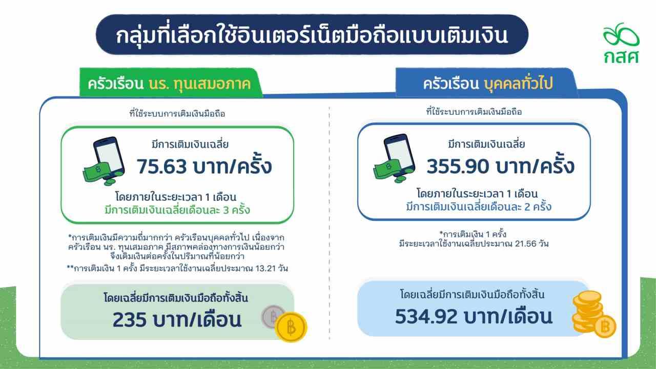 นอกจากนี้ การใช้งานอินเทอร์เน็ตมือแบบเติมเงิน นักเรียนทุนเสมอภาคจะเติมเงินเฉลี่ย 75.63 บาทต่อครั้ง หนึ่งเดือนเติมประมาณ 3 ครั้ง จ่ายเฉลี่ยทั้งเดือน 235 บาท ขณะที่ครัวเรือนทั่วไปเติมเงินเฉลี่ย 2 ครั้ง ครั้งละ 355.9 บาท จ่ายเฉลี่ยทั้งเดือน 534.92 บาท นอกจากสัดส่วนรายจ่ายกับรายได้จะห่างกันหลายเท่าตัวแล้ว ความแตกต่างของราคายังมีผลต่อความเร็วอินเทอร์เน็ต ส่วนอุปสรรคเรื่องการเติมเงิน นักเรียนทุนเสมอภาคส่วนใหญ่ไม่สามารถเดินทางไปเติมเงินตามร้านค้าได้ เนื่องจากมีค่าเดินทาง ตู้เติมเงินจึงเป็นทางเลือกสะดวกที่สุด แต่ก็มีต้นทุนสูงจากค่าธรรมเนียมที่จัดเก็บแบบขั้นบันได เช่น เติมเงิน 10 บาท จะได้ใช้อินเทอร์เน็ตจริงเพียง 8 บาท อีก 2 บาท ถูกหักเป็นค่าธรรมเนียมบริการ หรือคิดเป็นร้อยละ 20 ของเงินที่จ่าย ซึ่งหากเติม 1,000 บาท ค่าธรรมเนียมจะอยู่ที่ 50 บาท หรือร้อยละ 0.5 เท่านั้น โครงสร้างราคาดังกล่าวสะท้อนว่า ยิ่งเด็กมีรายได้น้อยยิ่งแบกรับภาระค่าธรรมเนียมเข้าถึงอินเทอร์เน็ตสูง ส่วนเด็กเศรษฐฐานะดีได้จ่ายในสัดส่วนที่ถูกกว่า
