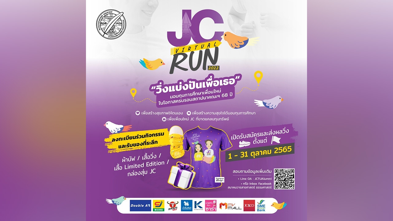 สมาคมวารสารศาสตร์ ธรรมศาสตร์ ขอเชิญศิษย์เก่า ศิษย์ปัจจุบัน และผู้ที่สนใจเข้าร่วมกิจกรรมวิ่งสนุกเพื่อสุขภาพ "JC Virtual Run 2022 วิ่งแบ่งปันเพื่อเธอ" เนื่องในโอกาสวันสถาปนาครบรอบ 68 ปีคณะวารสารศาสตร์และสื่อสารมวลชน มหาวิทยาลัยธรรมศาสตร์ เพื่อร่วมสมทบทุนการศึกษาเพื่อนใหม่ คณะวารสารศาสตร์และสื่อสารมวลชน ที่เรียนดีแต่ขาดโอกาส โดยกติกาการเข้าร่วม ผู้วิ่งสามารถวิ่งที่ไหนเมื่อไหร่ก็ได้ จากนั้นส่งระยะทางการวิ่งเข้าระบบ หากวิ่งได้ครบตามระยะทาง 68 กิโลเมตร จะได้รับ e-certificate พร้อมลุ้นรับรางวัลพิเศษจากศิษย์เก่าวารสารฯ คนดัง