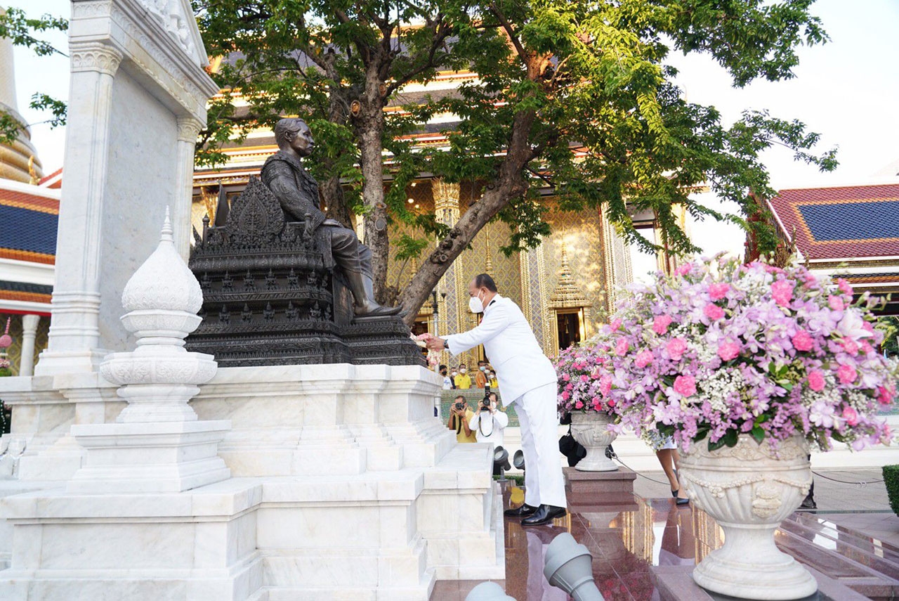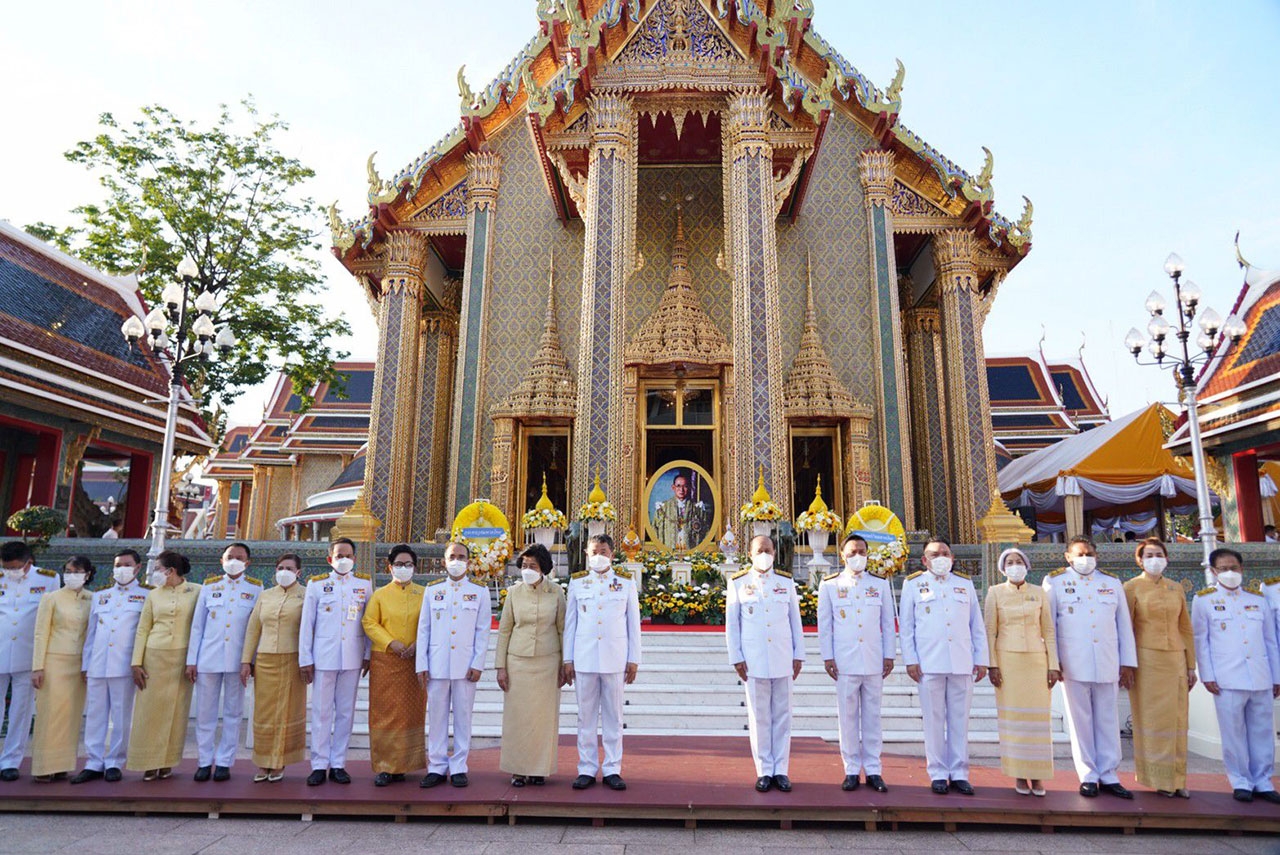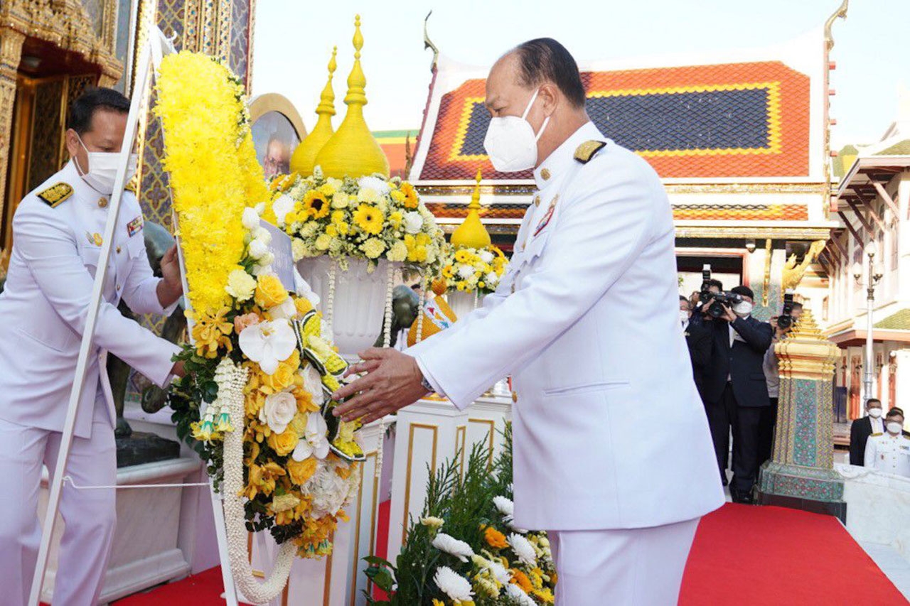 จากนั้น ในเวลา 07.00 น. พลเอก อนุพงษ์ เผ่าจินดา รัฐมนตรีว่าการกระทรวงมหาดไทย เป็นประธานในพิธีวางพวงมาลาเบื้องหน้าพระบรมฉายาลักษณ์ พระบาทสมเด็จพระบรมชนกาธิเบศร มหาภูมิพลอดุลยเดชมหาราช บรมนาถบพิตร ในนามกระทรวงมหาดไทย และ ดร.วันดี กุญชรยาคง จุลเจริญ นายกสมาคมแม่บ้านมหาดไทย วางพวงมาลาเบื้องหน้าพระบรมฉายาลักษณ์ พระบาทสมเด็จพระบรมชนกาธิเบศร มหาภูมิพลอดุลยเดชมหาราช บรมนาถบพิตร ในนามสมาคมแม่บ้านมหาดไทย และ พลเอก อนุพงษ์ เผ่าจินดา รัฐมนตรีว่าการกระทรวงมหาดไทย นำผู้ร่วมพิธียืนสงบนิ่งเป็นเวลา 89 วินาที แล้วกล่าวน้อมรำลึกในพระมหากรุณาธิคุณ ความโดยสรุปว่า “ตลอดระยะเวลากว่า 70 ปี แห่งรัชสมัยพระบาทสมเด็จพระบรมชนกาธิเบศร มหาภูมิพลอดุลยเดชมหาราช บรมนาถบพิตร ปวงพสกนิกรใต้ร่มพระบารมีทั่วราชอาณาจักร ต่างประจักษ์ซึ้งในพระมหากรุณาธิคุณและพระเมตตาที่ได้ทรงทุ่มเทกำลังพระวรกาย และกำลังพระสติปัญญาปฏิบัติพระราชกรณียกิจนานัปการ เพื่อประโยชน์สุขแห่งปวงพสกนิกร โครงการในพระราชดำริน้อยใหญ่ จำนวน 4,741 โครงการ ก่อให้เกิดประโยชน์อย่างอเนกอนันต์แก่ประเทศชาติ ทั้งได้พระราชทานหลักปรัชญาของเศรษฐกิจพอเพียง เพื่อเป็นแนวทางให้อาณาประชาราษฎร์ได้ดำเนินชีวิตโดยใช้ความรู้และสติปัญญาเป็นภูมิคุ้มกัน อีกทั้งยังก่อให้เกิดประโยชน์แก่ประชาชนของประเทศต่าง ๆ ที่ได้น้อมนำแนวทางพระราชทานไปปฏิบัติพระเกียรติคุณแผ่ไพศาลขจรขจายไปทั่วทิศานุทิศด้วยดวงจิตที่บริสุทธิ์ของปวงข้าพระพุทธเจ้าที่ล้วนสำนึกในพระมหากรุณาธิคุณอันหาที่สุดมิได้ ปวงข้าพระพุทธเจ้าจักน้อมนำแนวทางพระราชดำริที่ได้พระราชทานไว้เป็นเครื่องยึดเหนี่ยวในการปฏิบัติหน้าที่และดำรงตนเพื่อสร้างประโยชน์สุขแก่ประเทศชาติสืบไป”