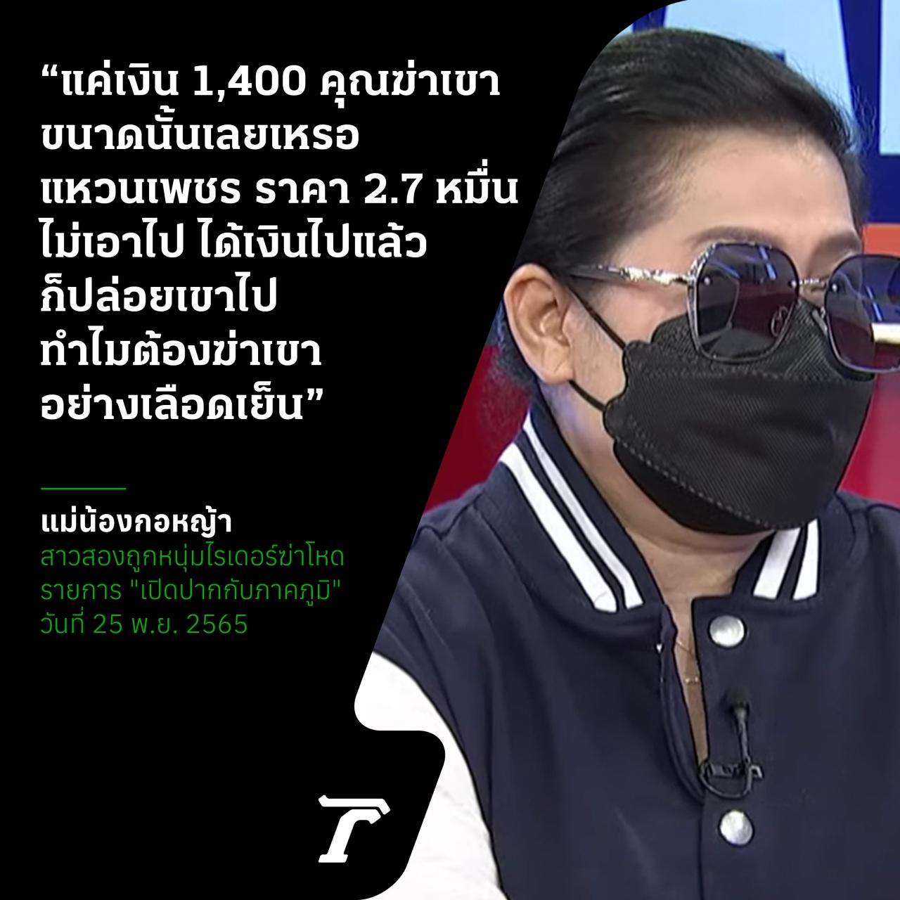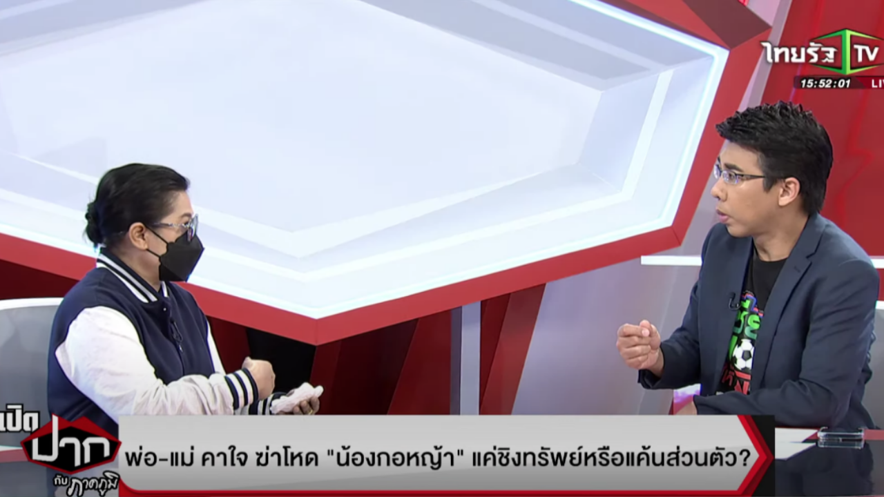 เมื่อเวลา 15.30 น. วันที่ 25 พฤศจิกายน 2565 ในรายการ "เปิดปากกับภาคภูมิ" ทางไทยรัฐทีวีช่อง 32 ดำเนินรายการโดย นายภาคภูมิ พันธุ์สถิตย์ ได้พูดคุยถึงกรณีหนุ่มไรเดอร์ อายุ 36 ปี ผู้ต้องหาในคดีฆ่า น้องกอหญ้า สาวประเภทสอง อายุ 29 ปี ใช้ดัมเบลกับโซ่พันคอทิ้งศพไว้ในคลองส่งน้ำ หมู่ 1 ต.คลองสอง อ.คลองหลวง จ.ปทุมธานี ซึ่งทางพ่อแม่ของผู้เสียชีวิตคาใจว่าเรื่องดังกล่าวเป็นการชิงทรัพย์ หรือมีความแค้นส่วนตัว