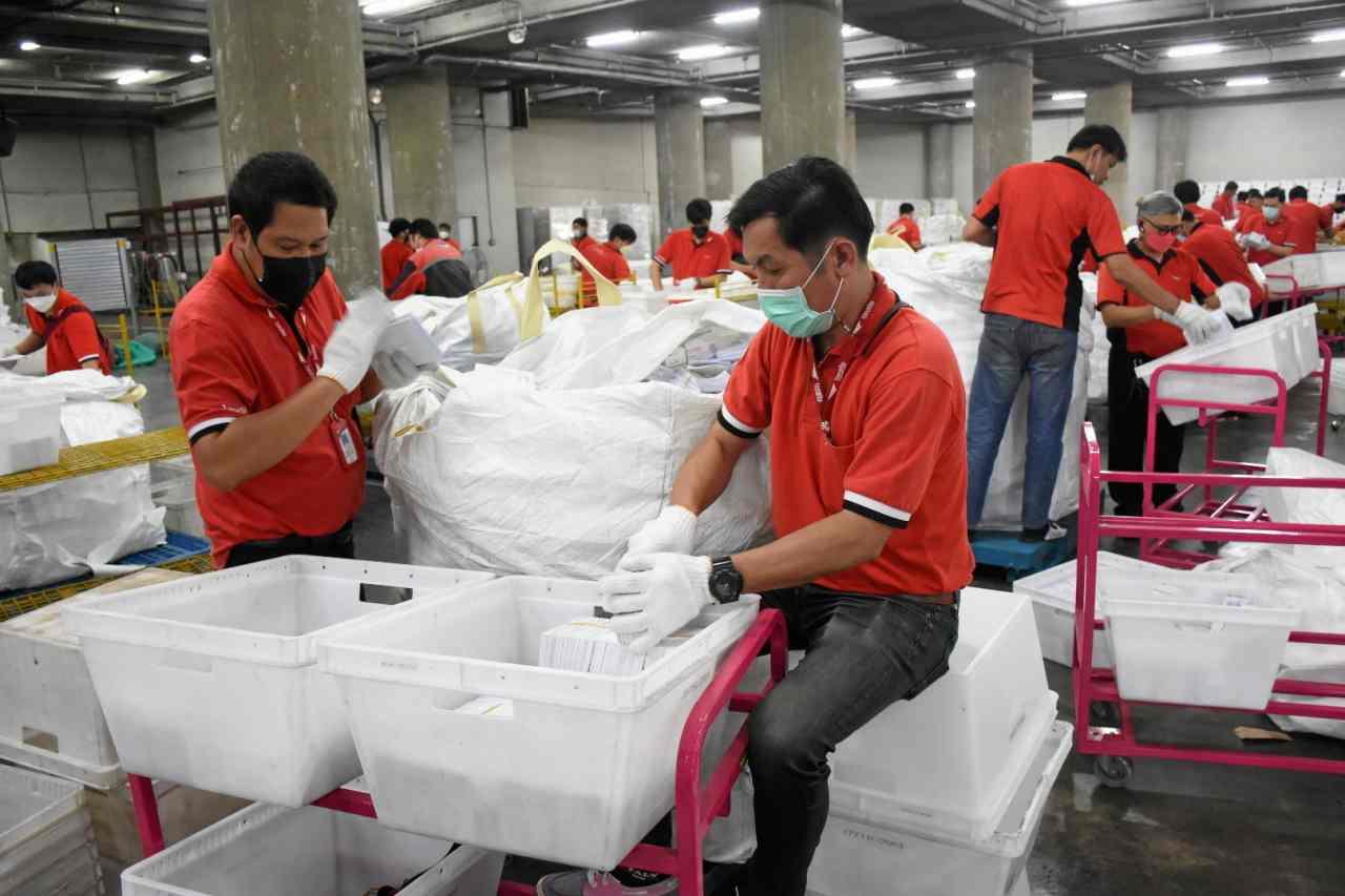 วันเดียวกัน ที่อาคารโกดัง 7 สำนักงานใหญ่ไทยรัฐกรุ๊ป ถ.วิภาวดีรังสิต ตั้งแต่ค่ำวันที่ 17 ธ.ค.ที่ผ่านมา เจ้าหน้าที่ไปรษณีย์ไทย ทั้งเขตนครหลวงและส่วนภูมิภาค ได้ทยอยขนส่งไปรษณียบัตรในเขตกรุงเทพมหานครและปริมณฑล รวมทั้งจังหวัดใกล้เคียงส่งมอบให้สำนักงานใหญ่ไทยรัฐกรุ๊ป เป็นจำนวนทั้งสิ้นแล้ว 30 ล้านฉบับ คาดว่า ไปรษณีย์ไทยจะจัดส่งไปรษณียบัตรทายผลฟุตบอลโลกจากทั่วประเทศสำนักงานใหญ่ไทยรัฐกรุ๊ป ครบร้อยเปอร์เซ็นต์ภายในวันที่ 22 ธ.ค.2565 จากนั้น ในวันที่ 23 ธ.ค.2565 จะเข้าสู่กระบวนการคัดแยกและตรวจสอบความถูกต้องต่อไป