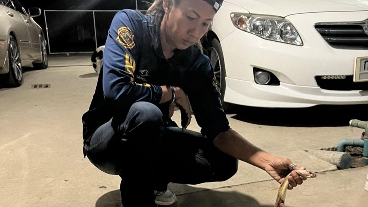 ในขณะที่ญาติช่วยกันใช้ไม้เขี่ยไล่งูอยู่นั้น หมาที่ชื่อฟ้า ก็ได้เข้างับคองูเห่าและต่อสู้กัน จนทั้งคู่ได้รับบาดเจ็บไปไหนไม่ไหว ตนจึงใช้กะละมังครอบไว้ พร้อมทั้งโทร.แจ้งเจ้าหน้าที่ที่ชำนาญในการจับงู นำไปปล่อยคืนสู่ธรรมชาติ