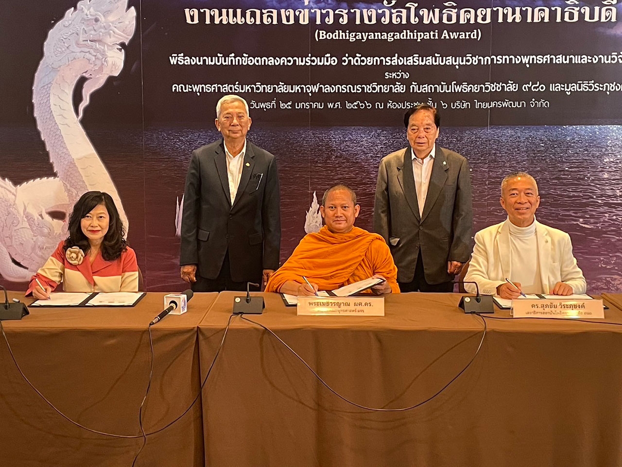ภายหลังการแถลงข่าวประกาศผลผู้ได้รับรางวัล “โพธิคยานาคาธิบดี” แล้ว ดร.วินัย วีระภุชงค์ ประธานมูลนิธิวีระภุชงค์ ได้เป็นประธานในพิธลงนามความร่วมมือทางวิชาการ (MoU) ว่าด้วยการส่งเสริมสนับสนุนทางวิชาการทางพระพุทธศาสนาและงานวิจัย ระหว่างคณะพุทธศาสตร์ มหาวิทยาลัยมหาจุฬาลงกรณราชวิทยาลัย กับสถาบันโพธิคยาวิชชาลัย 980 และ มูลนิธิวีระภุชงค์ โดย พระเมธีวรญาณ คณบดีคณะพุทธศาสตร์ มจร กับ และ ดร.สุภชัย วีระภุชงค์ เลขาธิการสถาบันโพธิคยาวิชชาลัย 980 และ น.ส.ทิพย์วรรณ วีระถุชค์ กรรมการมูลนิธิวีระภุชงค์ ร่วมลงนามความร่วมมือทางวิชาการ (MoU) ว่าด้วยการส่งเสริมสนับสนุนทางวิชาการทางพระพุทธศาสนาและงานวิจัย ความร่วมมือในครั้งนี้ เป็นการตั้งเป้าหมายร่วมกันในการทำงานที่เกี่ยวข้องกับพระพุทธศาสนา