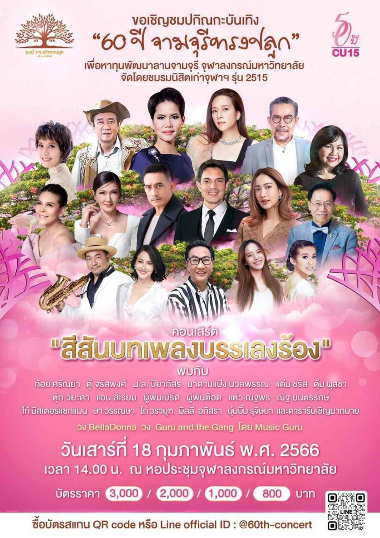 ชมรมนิสิตเก่าจุฬาฯ รุ่น 2515 ชวนชมรายการ "ปกิณกะบันเทิง 60 ปี จามจุรีทรงปลูก" การแสดงคอนเสิร์ต "สีสันบทเพลงบรรเลงร้อง" จัดโดยนิสิตเก่าจุฬาลงกรณ์มหาวิทยาลัย ปี 2515 ซึ่งได้รับความร่วมมือจากศิลปิน นักร้อง นักแสดงพี่เก่าจุฬาฯ คับคั่ง เพื่อระดมทุนช่วยจุฬาฯ ดูแลและทำนุบำรุง "ลานจามจุรีทรงปลูก" ที่มีอายุมากกว่า 60 ปี