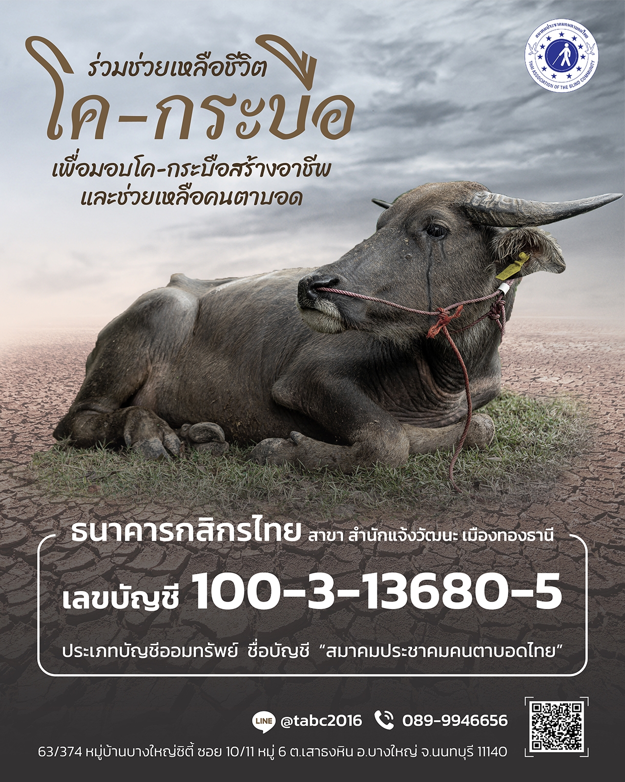 และหากไม่สะดวกที่จะไปร่วมกิจกรรมในวันเวลาดังกล่าวได้ สามารถร่วมทำบุญ โดยโอนเงินผ่านบัญชีธนาคารกสิกรไทย สาขาสำนักแจ้งวัฒนะ เมืองทองธานี เลขที่บัญชี 100-3-13680-5 ประเภทบัญชีออมทรัพย์ ชื่อบัญชี “สมาคมประชาคมคนตาบอดไทย” หรือสอบถามรายละเอียดเพิ่มเติมได้ทางหมายเลขโทรศัพท์ 08-9994-6656 หรือ 0-2036-6988 หรือทางแอปพลิเคชันไลน์ไอดี “@tabc2016” หรือสแกนคิวอาร์โค้ดที่