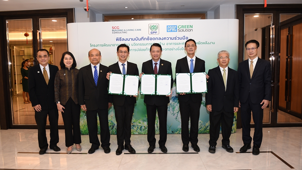 บริษัท เจริญโภคภัณฑ์อาหาร จำกัด (มหาชน) หรือ CPF ร่วมกับ บริษัท เอสซีจี บิลดิ้ง แอนด์ ลีฟวิ่งแคร์คอนซัลติ้ง จำกัด (BLC) บริษัทที่ปรึกษาในด้านการพัฒนาอาคารที่เป็นมิตรต่อสิ่งแวดล้อม และบริษัท ผลิตภัณฑ์และวัตถุก่อสร้าง จำกัด (CPAC) ผู้เชี่ยวชาญด้านนวัตกรรมการก่อสร้าง ภายใต้ธุรกิจซีเมนต์และผลิตภัณฑ์ก่อสร้าง เอสซีจี ร่วมลงนามบันทึกข้อตกลงความร่วมมือ “โครงการพัฒนาอาคารเขียว นวัตกรรมการก่อสร้าง อาคารและฟาร์มประหยัดพลังงาน เพื่อลดการปล่อยก๊าซเรือนกระจกอย่างยั่งยืน” นำร่อง 3 โครงการสร้างสุขภาวะที่ดีของผู้ใช้อาคาร เป็นมิตรกับชุมชนและสิ่งแวดล้อม ตอบโจทย์ก้าวสู่สังคมคาร์บอนต่ำ