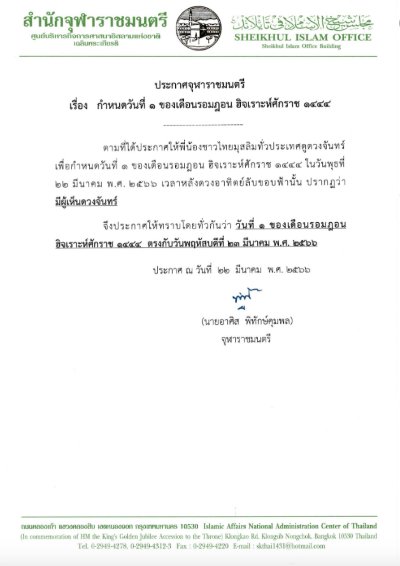 จึงประกาศให้ทราบโดยทั่วกันว่า วันที่ 1 ของเดือนรอมฎอน ฮิจเราะห์ศักราช 1444 ตรงกับวันพฤหัสบดีที่ 23 มีนาคม พ.ศ. 2566