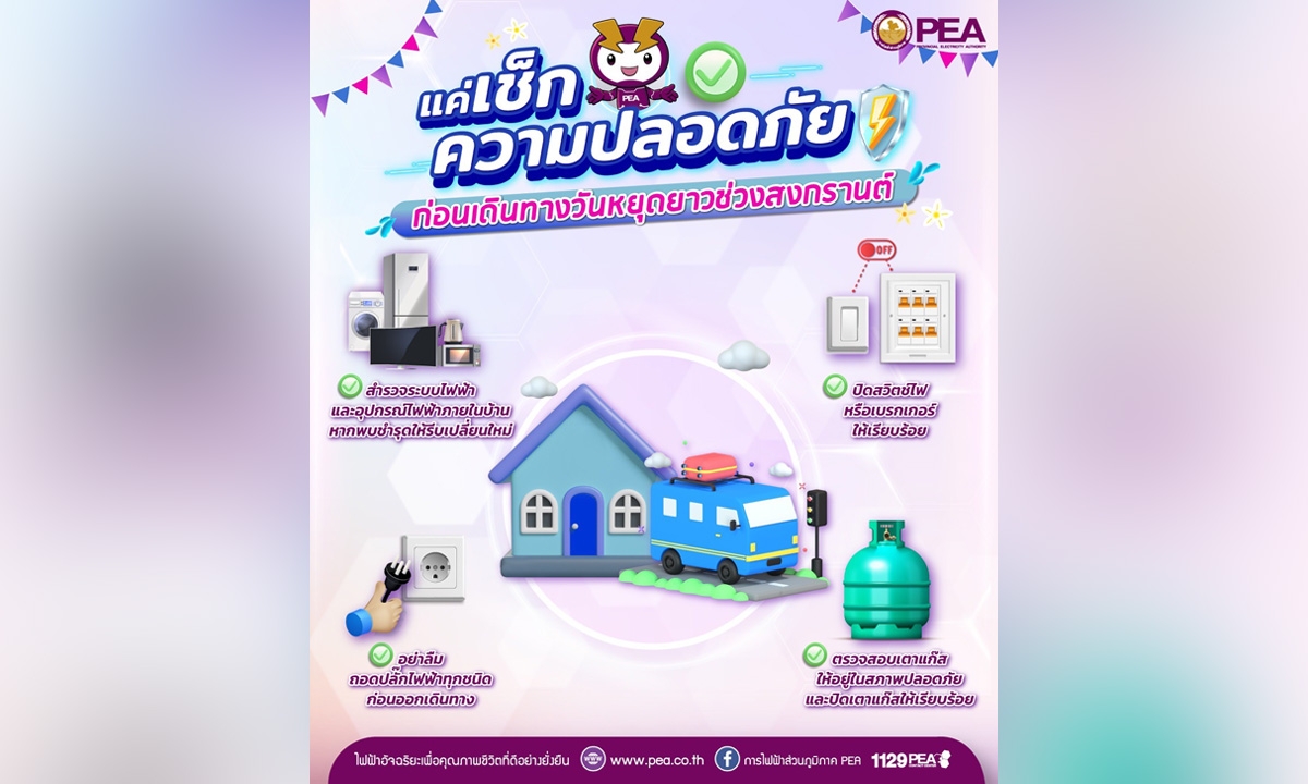 การไฟฟ้าส่วนภูมิภาค (PEA) มีความห่วงใยประชาชนในเรื่องการใช้ไฟฟ้าและการเดินทางในช่วงเทศกาลสงกรานต์ซึ่งถือเป็นช่วงวันหยุดยาวต่อเนื่องเป็นประจำทุกปี และประชาชนส่วนใหญ่เดินทางไปต่างจังหวัด เพื่อความปลอดภัยในการใช้ไฟฟ้าในช่วงวันหยุดยาว