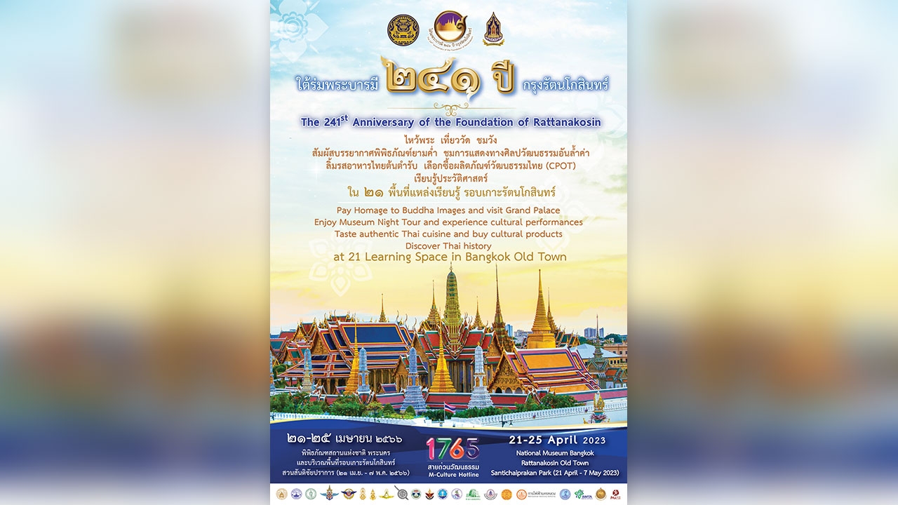 กระทรวงวัฒนธรรม ขอเชิญชวนประชาชนเข้าร่วมกิจกรรม พร้อมร่วมแต่งกายด้วยชุดไทยเข้าร่วมงานใต้ร่มพระบารมี 241 ปี กรุงรัตนโกสินทร์ สอบถามรายละเอียด ได้ที่สายด่วนวัฒนธรรม โทร.1765 หรือ www.m-culture.go.th