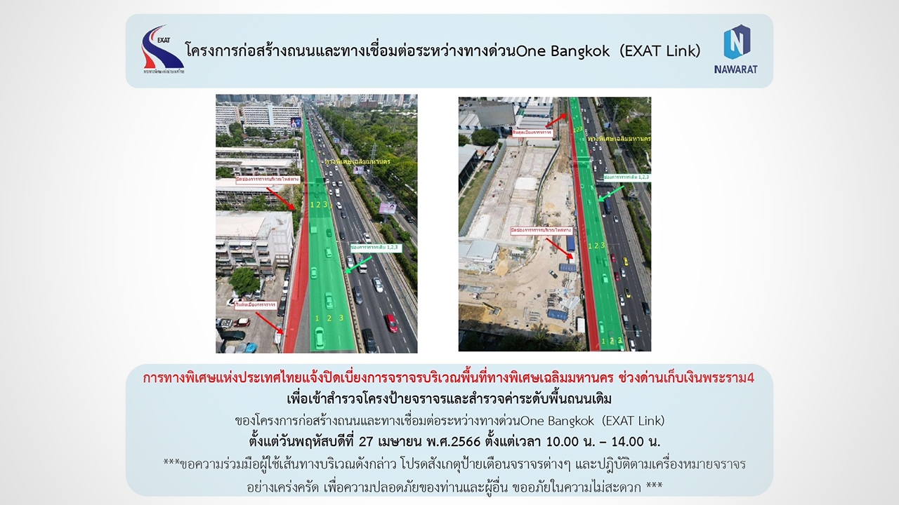 การทางพิเศษแห่งประเทศไทย (กทพ.) กระทรวงคมนาคมได้ร่วมมือกับ บริษัท วัน แบงค็อก จำกัด โดยได้ว่าจ้างบริษัท เนาวรัตน์พัฒนาการ จำกัด (มหาชน) เป็นผู้ดําเนินการก่อสร้างโครงการก่อสร้างถนนและทางเชื่อมต่อระหว่างทางด่วน One bangkok (Exat Link) ขอแจ้งปิดเบี่ยงการจราจร บนทางพิเศษเฉลิมมหานคร ช่วงด่านเก็บค่าผ่านทางพระราม 4 เพื่อดำเนินการสำรวจค่าระดับพื้นถนนและสำรวจโครงป้ายจราจร ตั้งแต่วันที่ 27 เมษายน 2566 ตั้งแต่เวลา 10.00 น.-14.00 น.