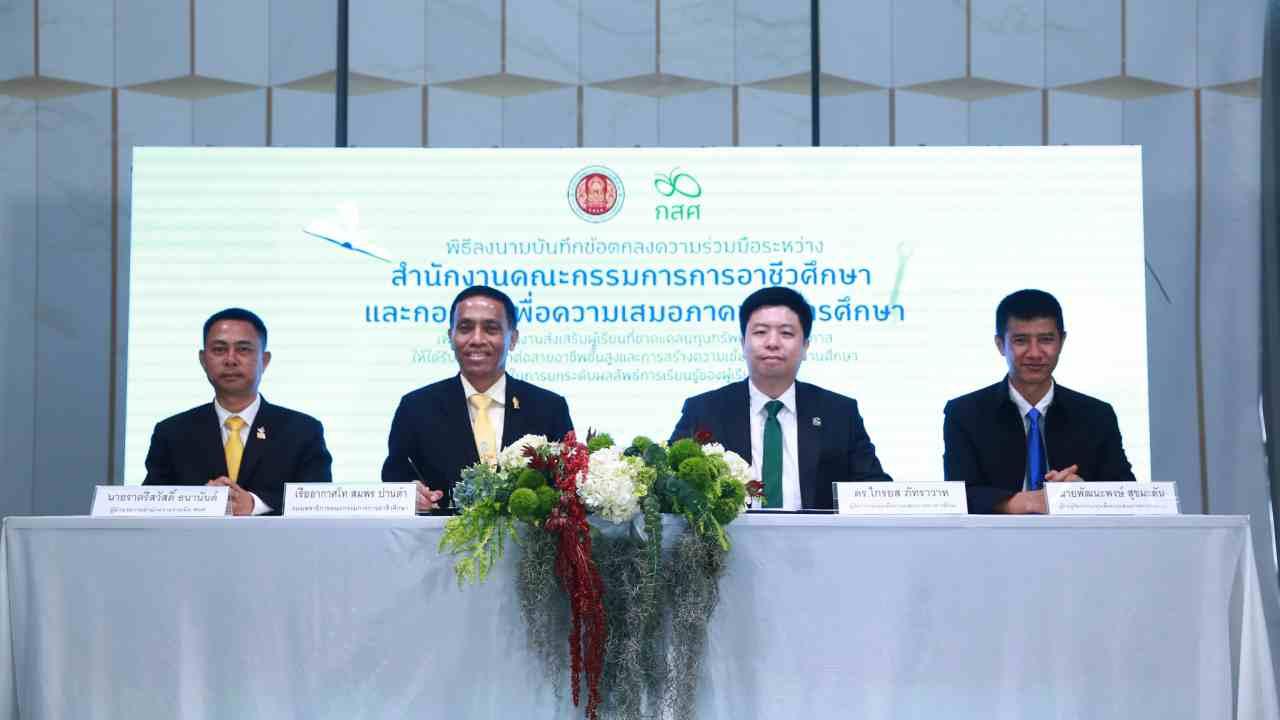 เมื่อวันที่ 23 พ.ค. 2566 ผู้สื่อข่าวรายงานว่า เมื่อวันที่ 22 พ.ค.ที่ผ่านมา เรืออากาศโท สมพร ปานดำ รองเลขาธิการคณะกรรมการการอาชีวศึกษา พร้อมด้วย ดร.ไกรยส ภัทราวาท ผู้จัดการกองทุนเพื่อความเสมอภาคทางการศึกษา ลงนามบันทึกข้อตกลงความร่วมมือ “เพื่อการดำเนินงานส่งเสริมผู้เรียนที่ขาดแคลนทุนทรัพย์หรือด้อยโอกาสให้ได้รับการศึกษาต่อสายอาชีพชั้นสูง และสร้างความเข้มแข็งสถานศึกษาในการยกระดับผลลัพธ์การเรียนรู้ของผู้เรียน” ณ โรงแรม เดอะ ควอเตอร์ อารีย์ กรุงเทพฯ