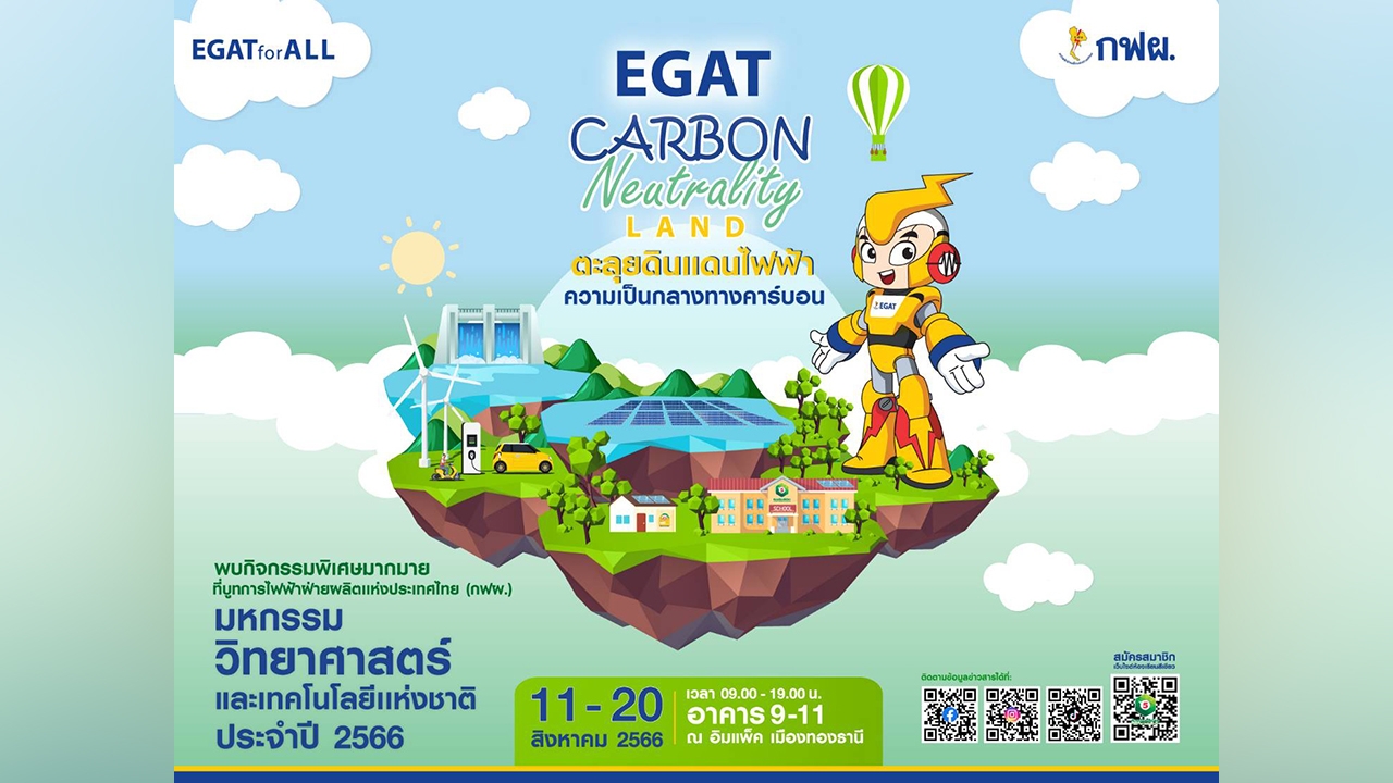 การไฟฟ้าฝ่ายผลิตแห่งประเทศไทย (กฟผ.) เตรียมเปิดบูธ “EGAT Carbon Neutrality Land : ตะลุยดินแดนไฟฟ้า ความเป็นกลางทางคาร์บอน” เชิญชวนเหล่านักผจญภัยรุ่นจิ๋วมาตะลุยดินแดนไฟฟ้าที่มุ่งสู่ความเป็นทางคาร์บอน ฝ่าภารกิจผลิตไฟฟ้าด้วยโซลาร์เซลล์ลอยน้ำไฮบริดเขื่อนสิรินธรขนาดใหญ่ที่สุดในโลก ผจญภัยด้วยยานยนต์ไฟฟ้าแห่งอนาคต ร่วมสะสมไอเทมประหยัดพลังงาน พิชิตคาร์บอนตัวร้ายผ่านโครงการปลูกป่าอย่างมีส่วนร่วม