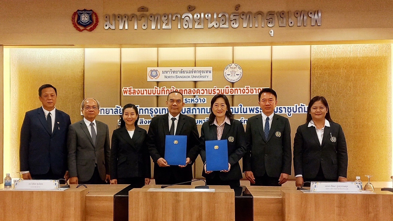ผศ.ดร.ปัทมา รูปสุวรรณกุล รองอธิการบดีอาวุโส มหาวิทยาลัยนอร์ทกรุงเทพ พร้อมด้วย ดร.วิเชียร ชุบไธสง นายกสภาทนายความในพระบรมราชูปถัมภ์ ร่วมลงนามบันทึกข้อตกลงความร่วมมือทางวิชาการ ระหว่าง มหาวิทยาลัยนอร์ทกรุงเทพ และสภาทนายความในพระบรมราชูปถัมภ์ โดยมีวัตถุประสงค์เพื่อส่งเสริม สนับสนุนด้านการจัดการเรียนการสอน การวิจัยเพื่อพัฒนาชุมชนและสังคม การบริการวิชาการทางด้านกฎหมายร่วมกันทั้งสองฝ่าย