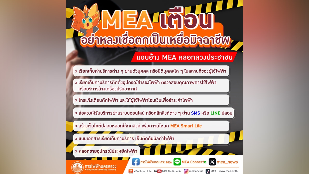 MEA หรือการไฟฟ้านครหลวง เตือนประชาชนระมัดระวังกลุ่มมิจฉาชีพหลอกลวงผู้ใช้ไฟฟ้า แอบอ้างเป็นเจ้าหน้าที่ MEA ให้บริการด้านไฟฟ้า หรือแอบอ้างว่าเป็นตัวแทนจาก MEA ให้บริการต่างๆ และเรียกเก็บเงินค่าบริการ นอกจากจะเสียทรัพย์สินแล้วอาจส่งผลกระทบทำให้ระบบไฟฟ้าไม่ได้มาตรฐาน เสี่ยงต่อความปลอดภัยในชีวิตและทรัพย์สินของประชาชนได้ โดยปัจจุบันพบรูปแบบการหลอกลวง อาทิ