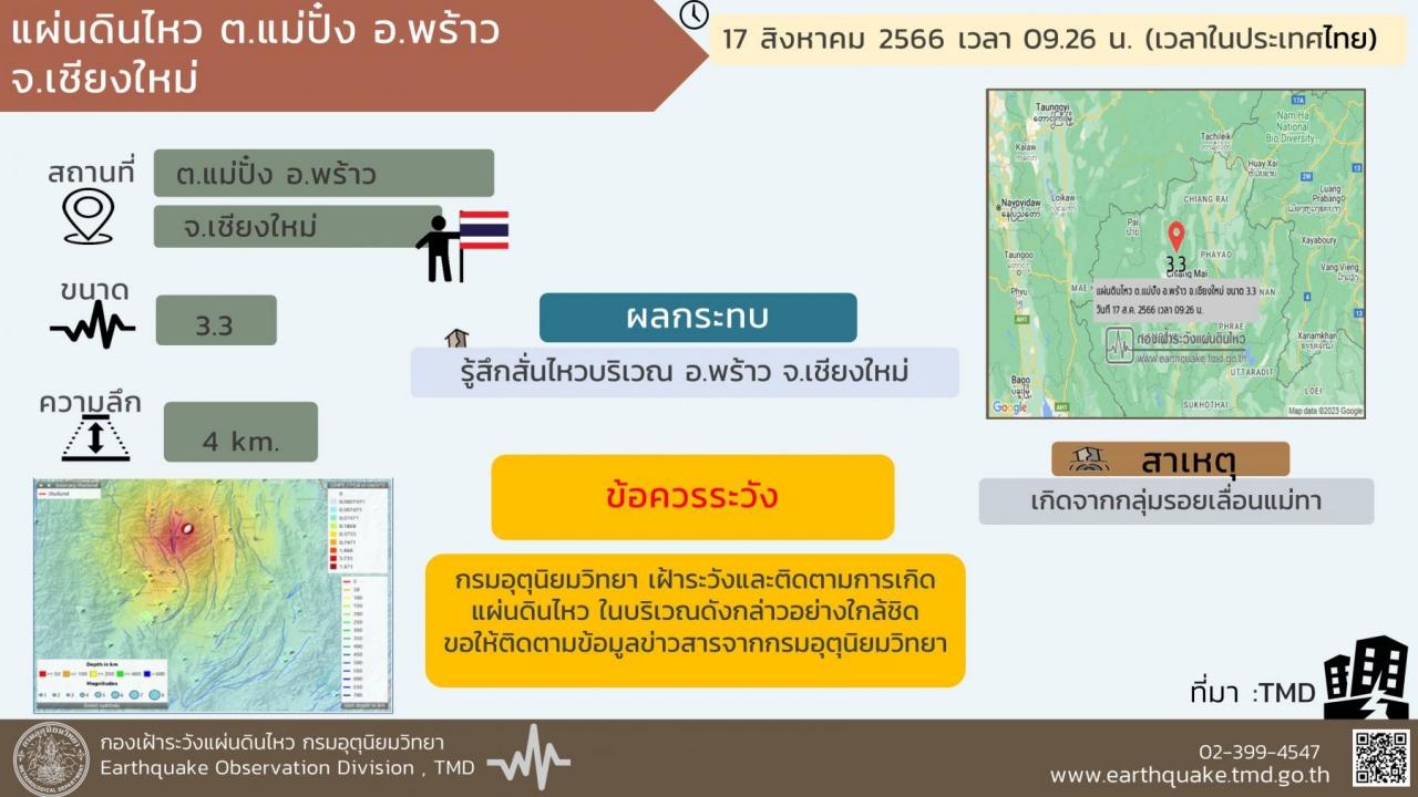 วันที่ 17 สิงหาคม 2566 ดร.ชมภารี ชมภูรัตน์ อธิบดีกรมอุตุนิยมวิทยา เปิดเผยว่า กรมอุตุนิยมวิทยา โดยกองเฝ้าระวังแผ่นดินไหว ออกประกาศเรื่อง แผ่นดินไหวที่ ต.แม่ปั๋ง อ.พร้าว จ.เชียงใหม่ ระบุว่า เมื่อวันที่ 17 สิงหาคม 2566 เวลา 09.26 น. เกิดแผ่นดินไหว จุดศูนย์กลางอยู่บริเวณ ต.แม่ปั๋ง อ.พร้าว จ.เชียงใหม่ ที่ละติจูด 19.175 องศาเหนือ ลองจิจูด 99.206 องศาตะวันออก ขนาด 3.3 ความลึก 4 กิโลเมตร ได้รับแจ้งรู้สึกสั่นไหวบริเวณ อ.พร้าว จ.เชียงใหม่