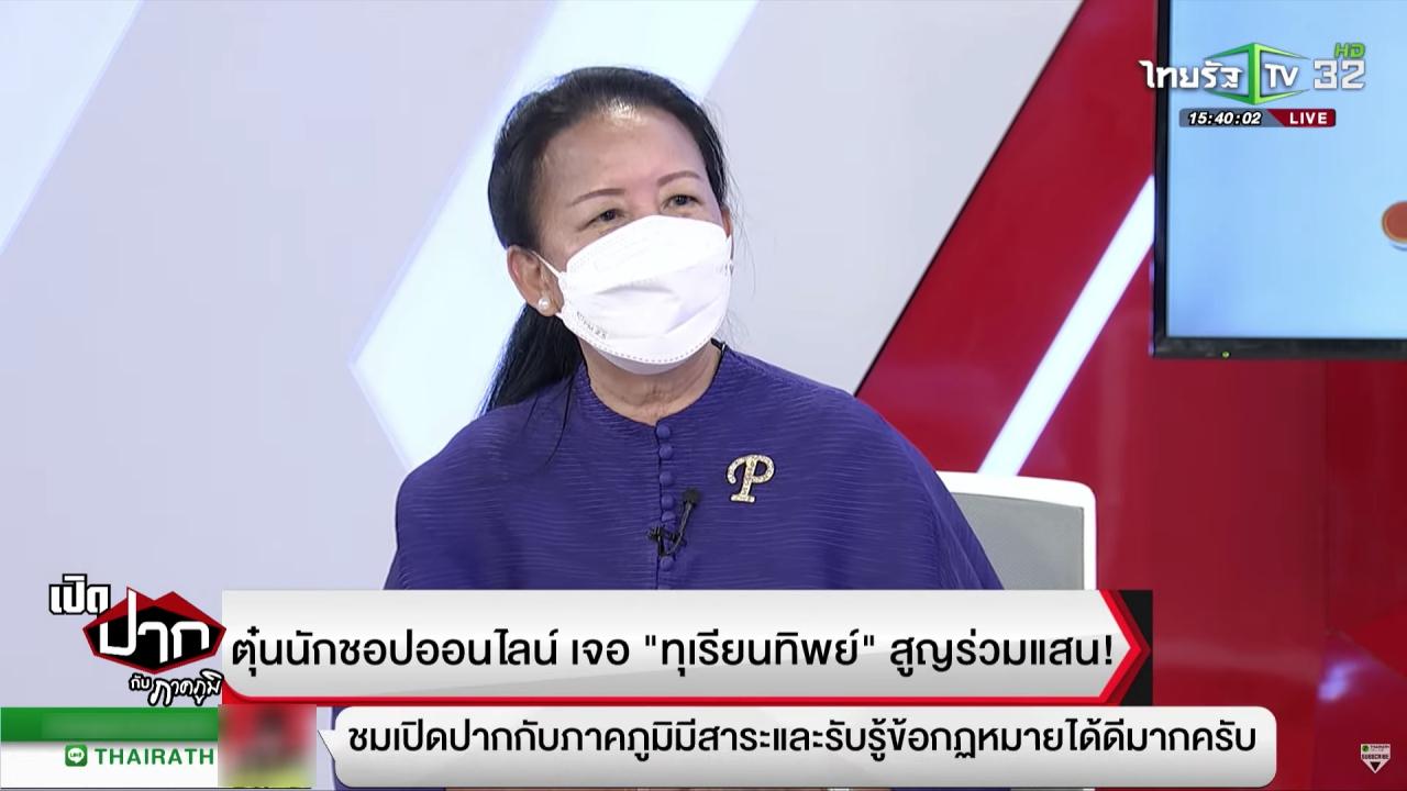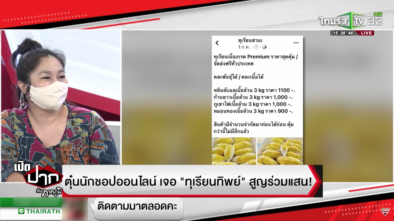 เมื่อเวลา 15.30 น. วันที่ 5 กันยายน 2566 ในรายการ "เปิดปากกับภาคภูมิ" ทางไทยรัฐทีวี ช่อง 32 ดำเนินรายการโดย นายภาคภูมิ พันธุ์สถิตย์ ซึ่งเป็นเทปครบรอบ 1 ปี ได้พูดคุยกับแขกรับเชิญถึงประเด็น เตือนภัยนักช็อปออนไลน์ เจอตุ๋น "ทุเรียนทิพย์" สูญร่วมแสน เสียทั้งเงิน เสียทั้งความรู้สึก