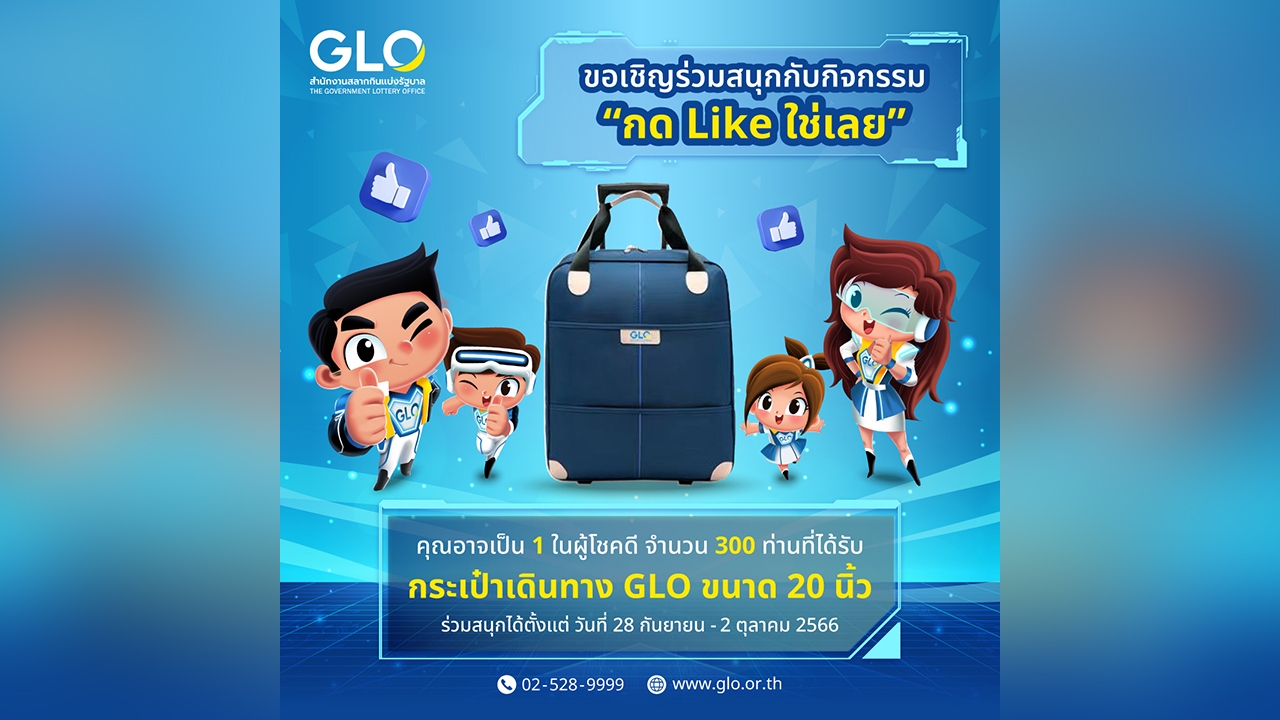 สำนักงานสลากกินแบ่งรัฐบาล เชิญชวนประชาชนร่วมสนุกในกิจกรรม “กด Like ใช่เลย” ลุ้นรับกระเป๋าเดินทาง GLO ขนาด 20 นิ้ว จำนวน 300 รางวัล รางวัลละ 500 บาท