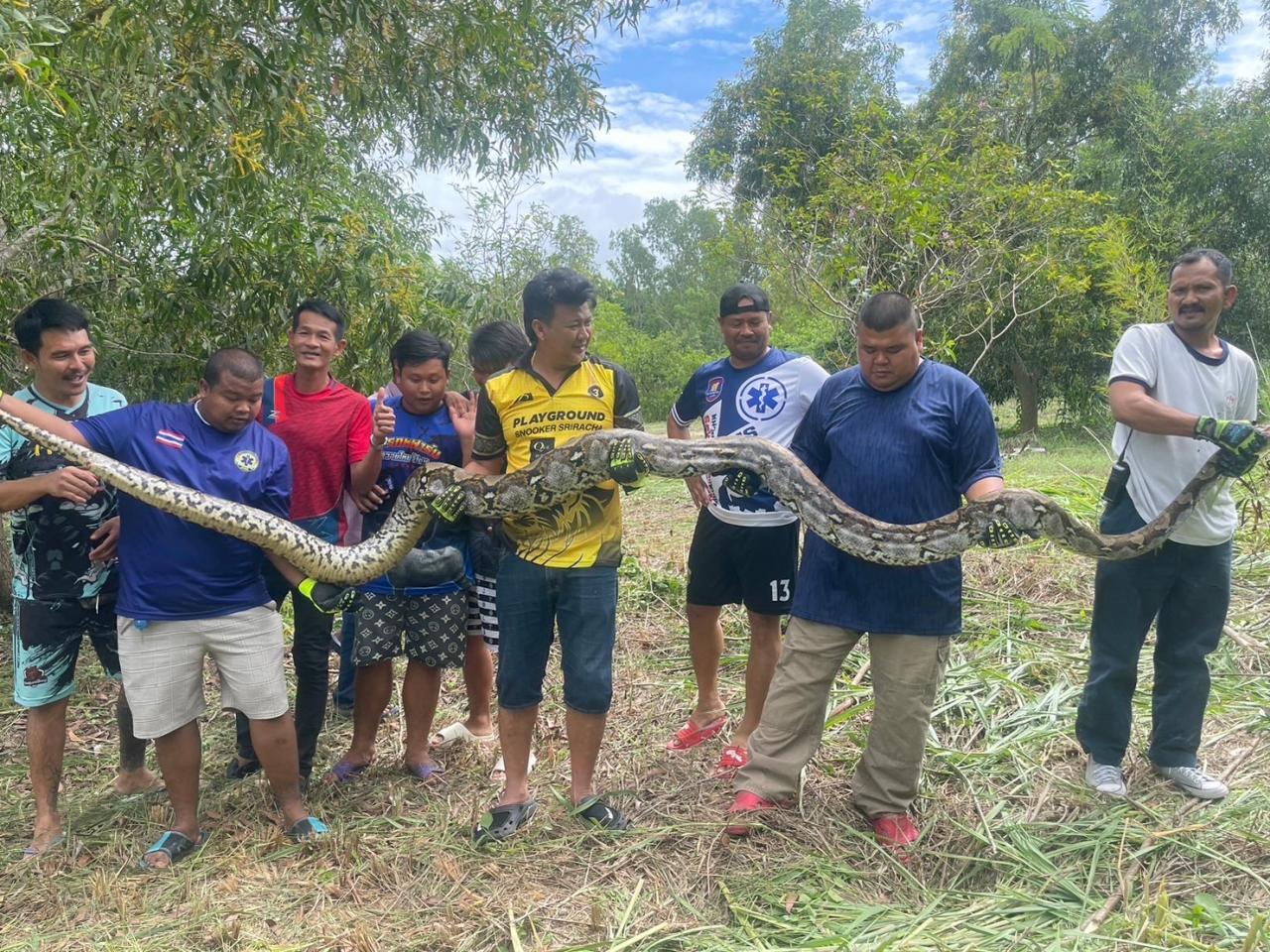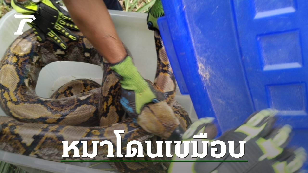 คนตัดหญ้าแจ้งกู้ภัยจับ "งูเหลือมยักษ์" 5 เมตร กำลังเขมือบสุนัขท้องแก่ ใช้กำลังคนถึง 10 คนจึงสามารถจับลงกล่องพลาสติกได้