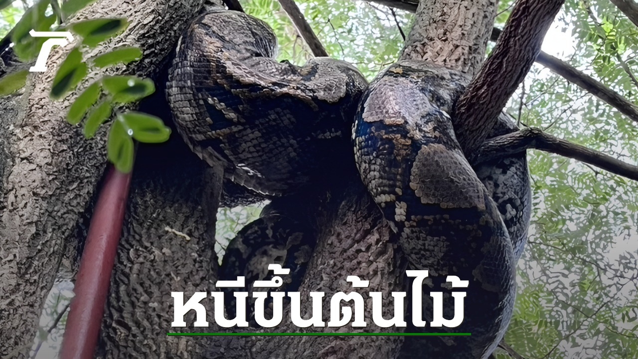 เจ้าหน้าที่ดับเพลิง จับระทึก "งูเหลือมยักษ์" 5.5 เมตร เขมือบไก่เลื้อยหนีขึ้นต้นมะขาม รัดพันแน่น ต้องเรียกกำลังเสริมมาช่วยกันจับ 7 คน กว่าจะนำตัวลงมาได้