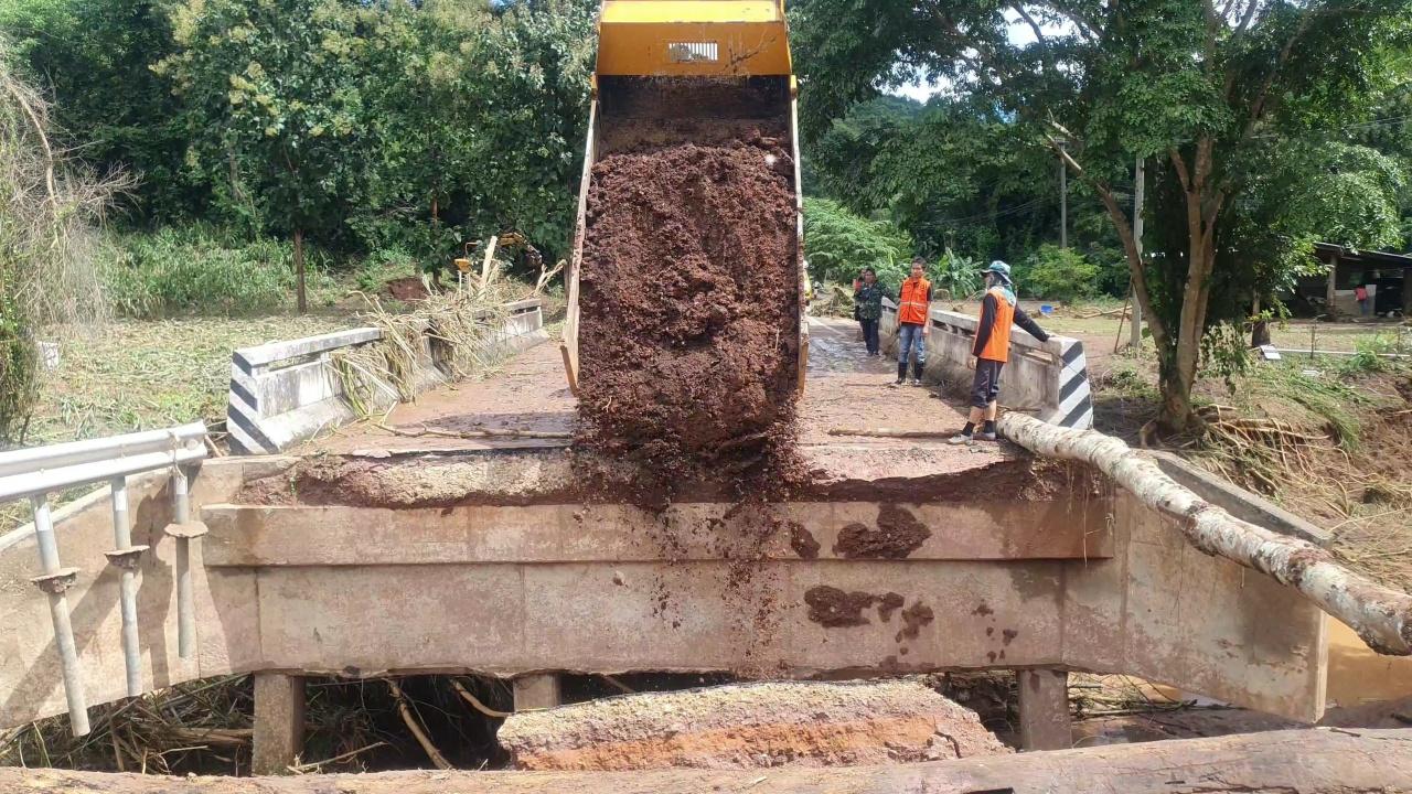 ขณะเดียวกัน หน่วยงานปกครองและกรมทางหลวง ได้นำรถแบ็กโฮเข้าทำการรื้อกอไผ่และเศษไม้ที่ติดใต้คอสะพาน ก่อนนำดินเข้ามาถมเคลียร์เส้นทาง เพื่อให้รถสัญจรไปมาได้