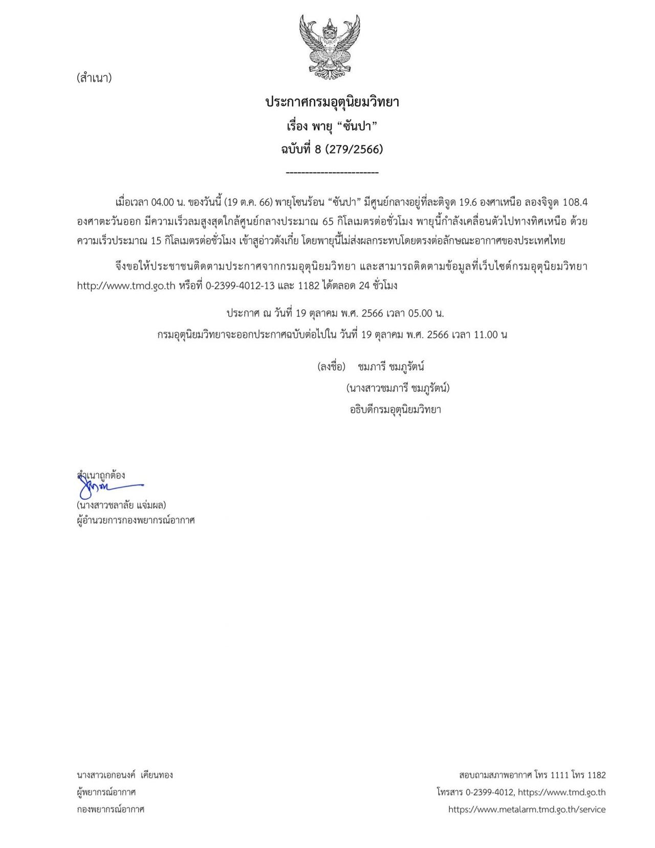 วันที่ 19 ตุลาคม 2566 มีรายงานว่า ประกาศกรมอุตุนิยมวิทยา เรื่อง พายุ "ซันปา" ฉบับที่ 8 ระบุว่า เมื่อเวลา 04.00 น. ที่ผ่านมา พายุโซนร้อน "ซันปา" มีศูนย์กลางอยู่ที่ละติจูด 19.6 องศาเหนือ ลองจิจูด 108.4 องศาตะวันออก มีความเร็วลมสูงสุดใกล้ศูนย์กลางประมาณ 65 กิโลเมตรต่อชั่วโมง พายุนี้กำลังเคลื่อนตัวไปทางทิศเหนือ ด้วยความเร็วประมาณ 15 กิโลเมตรต่อชั่วโมง เข้าสู่อ่าวตังเกี๋ย โดยพายุนี้ไม่ส่งผลกระทบโดยตรงต่อลักษณะอากาศของประเทศไทย