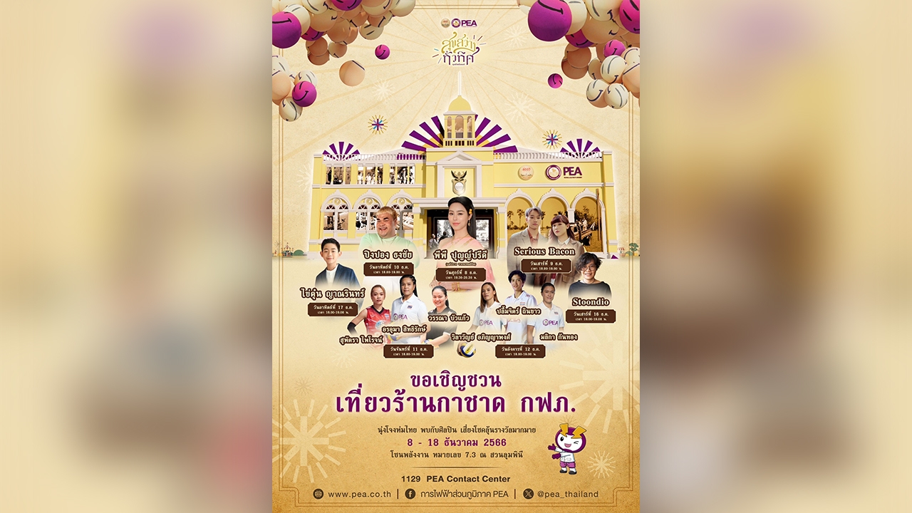 PEA ขอเชิญชวนเยี่ยมชมและร่วมกิจกรรมร้านกาชาดการไฟฟ้าส่วนภูมิภาค โซนพลังงาน หมายเลข 7.3 ภายใต้แนวคิด “สุขสว่างทั่วทิศ ทุกชีวิตรื่นรมย์” ตั้งแต่วันที่ 8 - 18 ธันวาคม 2566 เวลา 11.00 น. - 22.00 น. ในรูปแบบ On ground ณ สวนลุมพินี กรุงเทพมหานคร และ Online บนแพลตฟอร์ม www.งานกาชาด.com www.redcrossfair.com ตลอด 24 ชั่วโมง