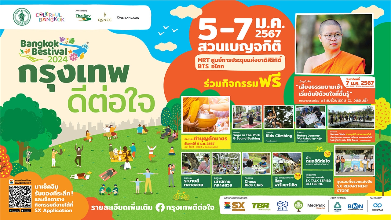 ให้การเริ่มต้นปีเต็มไปด้วยพลังดีๆ และความสุขกายสุขใจ “กรุงเทพ ดีต่อใจ Bangkok Bestival 2024” กิจกรรมเพื่อหัวใจเบิกบาน และอิ่มเอมสำหรับทุกคน ตั้งแต่วันที่ 5-7 มกราคม 2567 ณ สวนเบญจกิติ และสวนลุมพินี