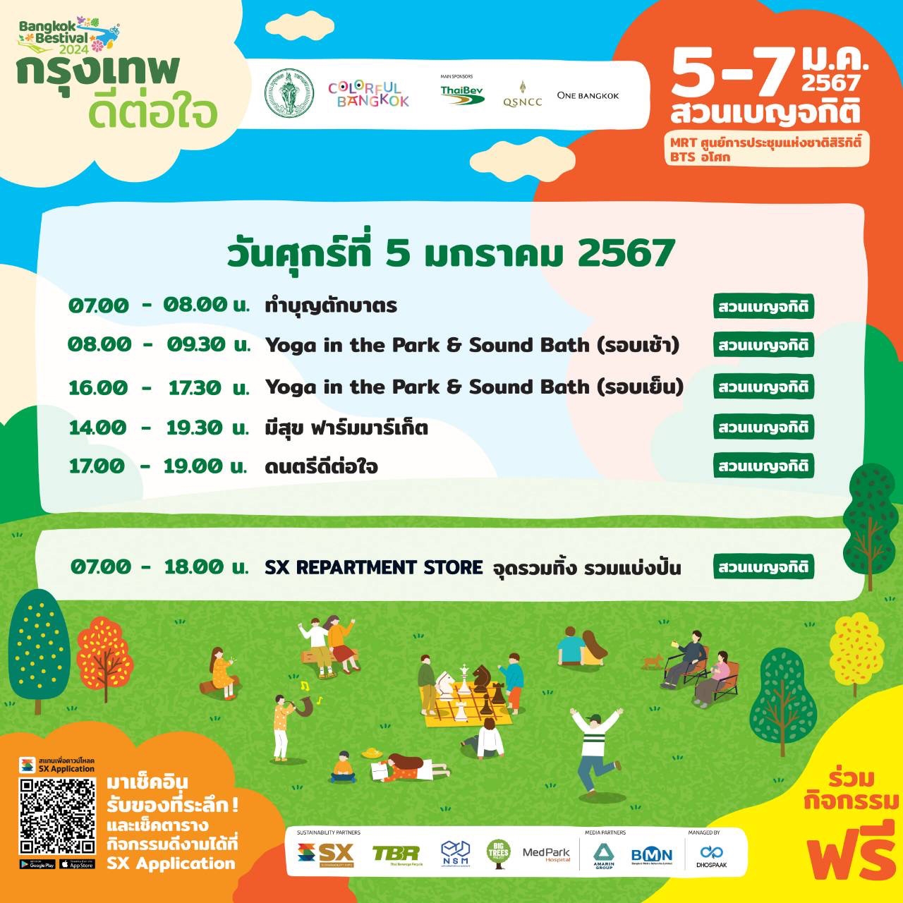 กิจกรรมแห่งความสุขคือของขวัญของหัวใจที่มีความหมายสำหรับทุกคน “กรุงเทพ ดีต่อใจ” Bangkok Bestival 2024 กลับมาอีกครั้งเพื่อต้อนรับศักราชใหม่ เริ่มต้นด้วยวัน “ศุกร์แรก” ของปีกับกิจกรรมสร้าง “สุขแรก” พร้อมรอยยิ้มและความอบอุ่นใจ ซึ่งทั้งหมดคือความตั้งใจจะเป็นส่วนหนึ่งในการมอบคุณภาพชีวิตที่ดีให้คนกรุงเทพฯ ได้สุขกาย สุขใจ และเปี่ยมด้วยพลังไปตลอดปี โดยกิจกรรมดีๆ เหล่านี้จะเกิดขึ้นตั้งแต่วันที่ 5-7 มกราคม 2567 ณ สวนเบญจกิติ และสวนลุมพินี โดยไม่เสียค่าใช้จ่ายใดๆ