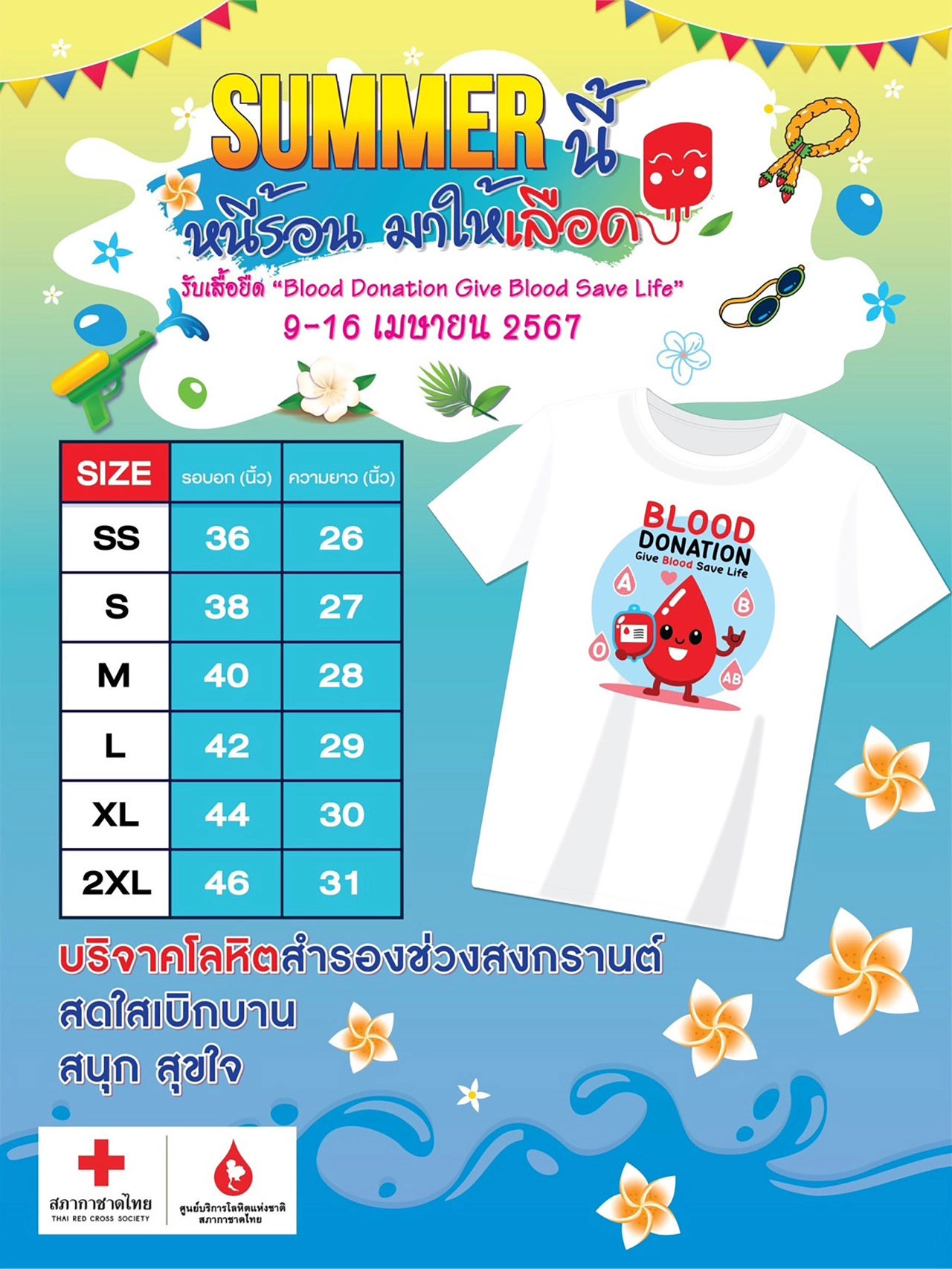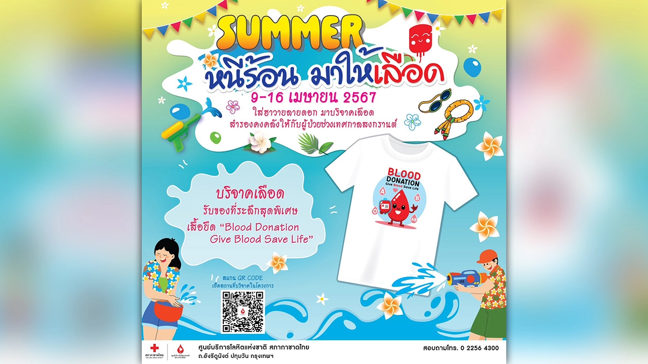 ศูนย์บริการโลหิตแห่งชาติ ชวนใส่เสื้อฮาวายลายดอก บริจาคโลหิตในโครงการ "แล้งนี้ไม่แล้งน้ำใจ ด้วยการให้โลหิต" เตรียมพร้อมสำรองโลหิตรับมือหยุดยาวช่วงเทศกาลสงกรานต์ ระหว่างวันที่ 9-16 เมษายน 2567 ณ ศูนย์บริการโลหิตแห่งชาติ หน่วยรับบริจาคโลหิตประจำที่ (Fixed Station) และภาคบริการโลหิตแห่งชาติ ทั่วประเทศ พร้อมรับเสื้อยืดสุดเท่ “BLOOD DONATION Give Blood Save Life” แทนคำขอบคุณ