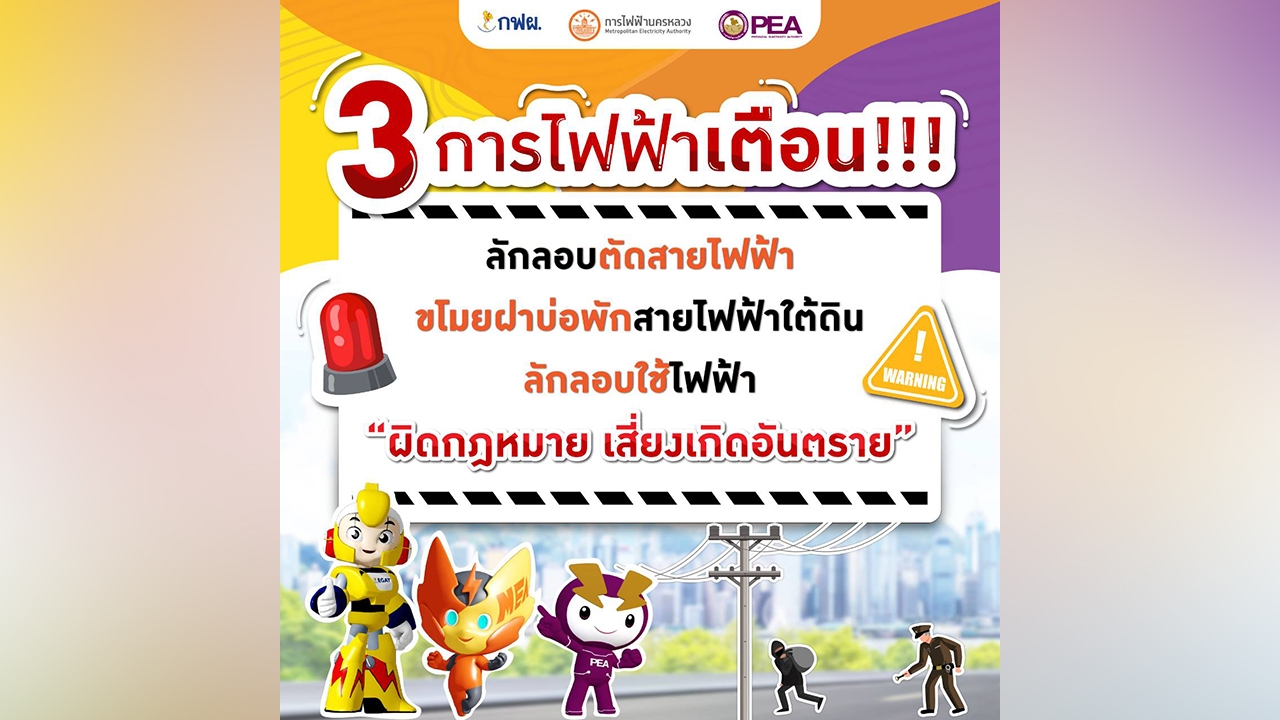 3 การไฟฟ้า ในฐานะหน่วยงานรัฐวิสาหกิจด้านพลังงานไฟฟ้าของประเทศ ประกอบด้วย การไฟฟ้าฝ่ายผลิตแห่งประเทศไทย (กฟผ.) การไฟฟ้านครหลวง (MEA) และการไฟฟ้าส่วนภูมิภาค (PEA) เตือนผู้ลักลอบตัดสายไฟฟ้า ลักลอบขโมยฝาบ่อพักชั่วคราวที่ใช้วางท่อร้อยสายไฟฟ้าใต้ดิน และลักลอบใช้ไฟฟ้าผิดกฎหมาย ไม่ปลอดภัย เสี่ยงเกิดอันตราย