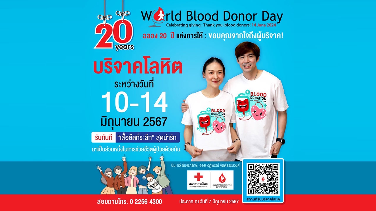 ศูนย์บริการโลหิตแห่งชาติ สภากาชาดไทย ชวนคนไทยบริจาคโลหิตเฉลิมฉลองครบรอบ 20 ปี แห่งการขอบคุณผู้บริจาคโลหิต เนื่องในวันผู้บริจาคโลหิตโลก (World Blood Donor Day) 14 มิถุนายน ภายใต้แนวคิด “เฉลิมฉลอง 20 ปี แห่งการให้ ขอบคุณจากใจถึงผู้บริจาคโลหิต” วันที่ 10-14 มิถุนายน 2567 ณ ศูนย์บริการโลหิตแห่งชาติ หน่วยรับบริจาคโลหิตประจำที่ 7 แห่ง โรงพยาบาลสาขาบริการโลหิตแห่งชาติ 8 แห่งในกรุงเทพฯ และภาคบริการโลหิตแห่งชาติ 12 แห่งทั่วประเทศ รับเสื้อยืด “20 years of celebrating giving : Thank you, blood donors! 14 June 2024” เป็นที่ระลึกแทนคำขอบคุณ