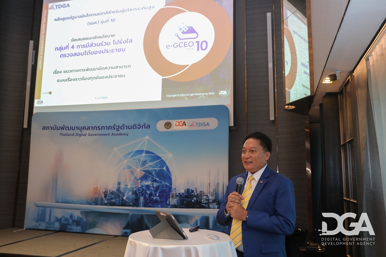 นางไอรดา รองผู้อำนวยการ รักษาการแทนผู้อำนวยการ DGA กล่าวว่า หลักสูตร e-GCEO#10 นี้ เป็นหลักสูตรเพื่อการพัฒนาศักยภาพการเป็นผู้นำดิจิทัลของผู้บริหารระดับสูงภาครัฐให้มีความรู้ความเข้าใจเกี่ยวกับทิศทาง นโยบาย ที่สอดคล้องกับแผนพัฒนารัฐบาลดิจิทัลของประเทศไทย โดยเน้นให้ผู้เข้าอบรมได้รับองค์ความรู้จากวิทยากรผู้ทรงคุณวุฒิที่มีความเชี่ยวชาญ พร้อมทั้งการศึกษาดูงานหน่วยงานด้านดิจิทัลชั้นนำในประเทศและต่างประเทศเพื่อให้ได้สัมผัสจากประสบการณ์จริงสามารถนำมาถอดบทเรียนและนำองค์ความรู้ที่ได้รับนำความรู้ไปประยุกต์ในการนำพาองค์กรภายใต้การกำกับดูแลขับเคลื่อนสู่รัฐบาลดิจิทัลได้อย่างเป็นรูปธรรม ทั้งนี้ ผู้เข้าร่วมอบรมได้ร่วมกันนำเสนอข้อเสนอแนะเชิงนโยบายเพื่อการขับเคลื่อนสู่รัฐบาลดิจิทัลต่อผู้ทรงคุณวุฒิ จำนวน 4 โครงการ ได้แก่ 1. การพัฒนาระบบให้บริการด้านสาธารณสุขที่ทั่วถึง เท่าเทียม และยั่งยืน 2. การดูแลนักท่องเที่ยวแบบครบวงจร (Fully Happy Tourist Journey) 3. แนวทางการจัดทําฐานข้อมูลด้านสิทธิและสวัสดิการผู้สูงอายุไทย และ 4. แนวทางการพัฒนาขีดความสามารถระบบเรื่องราวร้องทุกข์ของประชาชน DGA จึงหวังเป็นอย่างยิ่งว่าหลักสูตรของสถาบัน TDGA ที่ร่วมกันพัฒนากับหน่วยงานพันธมิตรจะเป็นแหล่งบ่มเพาะองค์ความรู้ที่สำคัญของประเทศในการสร้างความแข็งแกร่งทักษะบุคลากรภาครัฐด้านดิจิทัลได้อย่างต่อเนื่อง ปัจจุบันมีผู้ผ่านการอบรมหลักสูตร e-GCEO ของสถาบัน TDGA มาแล้วกว่า 269 คน โดยจัดมาแล้ว 10 รุ่น สำหรับผู้ที่สนใจหลักสูตรการพัฒนาทักษะบุคลากรภาครัฐด้านเทคโนโลยีหลักสูตรอื่นๆ สามารถอัปเดตข้อมูลได้ที่เว็บไซต์ tdga.dga.or.th
