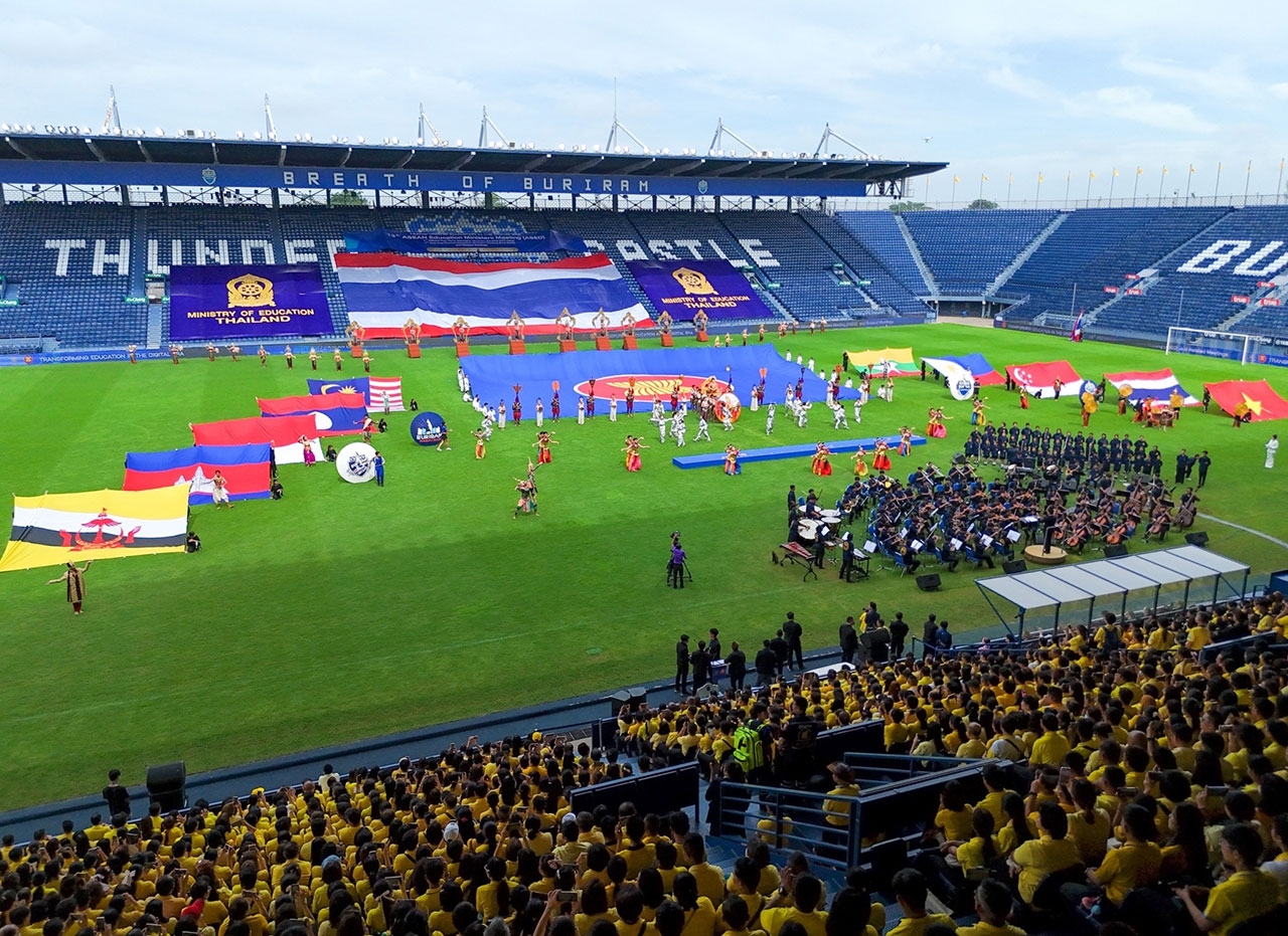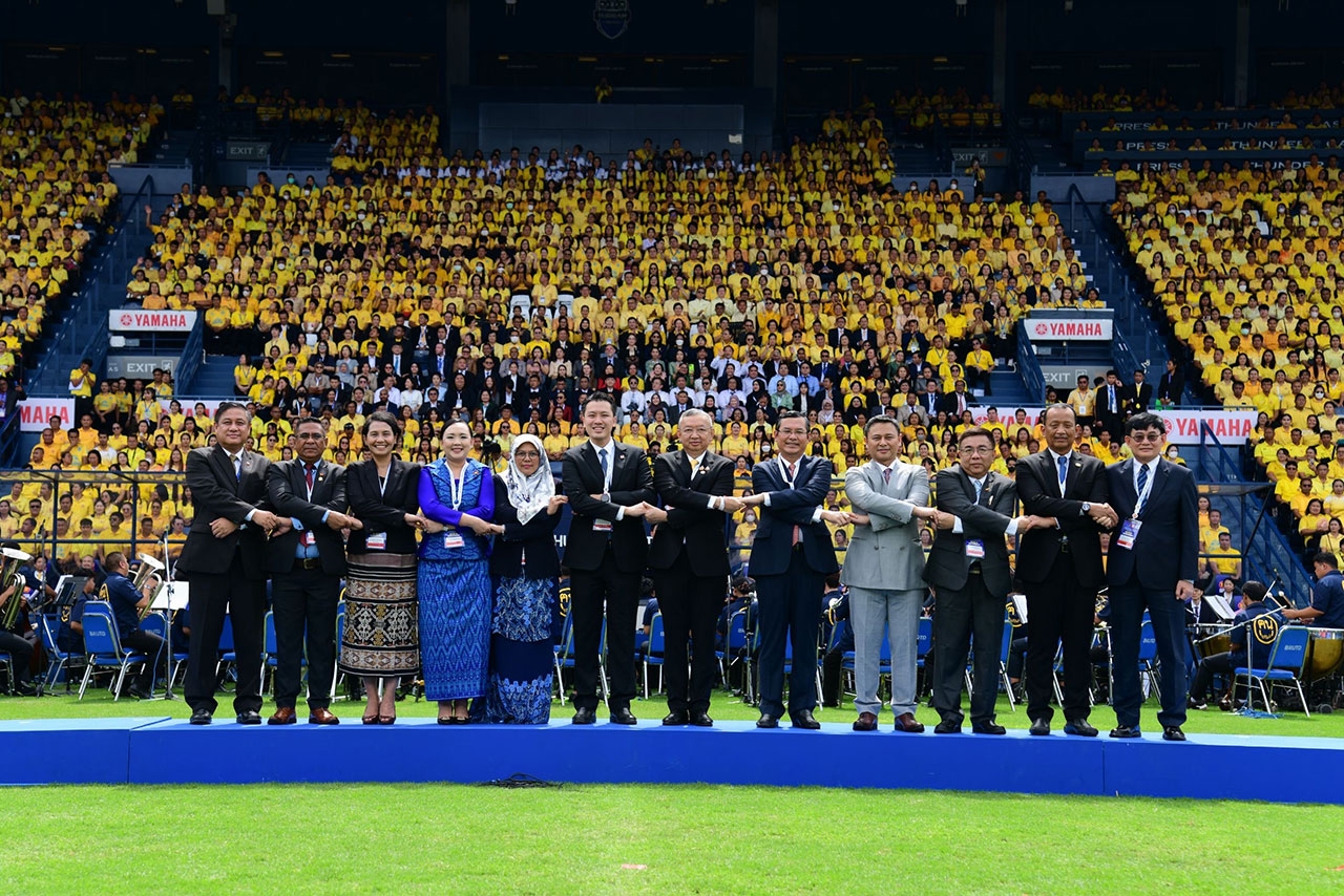 บรรยากาศในสนามช้างอารีนาเต็มไปด้วยความมีชีวิตชีวาและความเป็นหนึ่งเดียว ทุกคนพร้อมใจกันสวมเสื้อสีเหลือง เพื่อสร้างความประทับใจให้กับคณะผู้มาเยือนจากประเทศสมาชิกอาเซียน ติมอร์-เลสเต และประเทศคู่เจรจา เจ้าบ้านกว่า 10,000 คน ร่วมกันต้อนรับแขกผู้มีเกียรติอย่างอบอุ่นและสมเกียรติ โดยมี พลตำรวจเอกเพิ่มพูน ชิดชอบ รัฐมนตรีว่าการกระทรวงศึกษาธิการ เป็นผู้กล่าวเปิดงานในนามของประชาชนและรัฐบาลแห่งราชอาณาจักรไทย ด้วยถ้อยคำที่สะท้อนถึงความตั้งใจและความมุ่งมั่นในการเตรียมความพร้อมสำหรับการประชุมครั้งสำคัญนี้