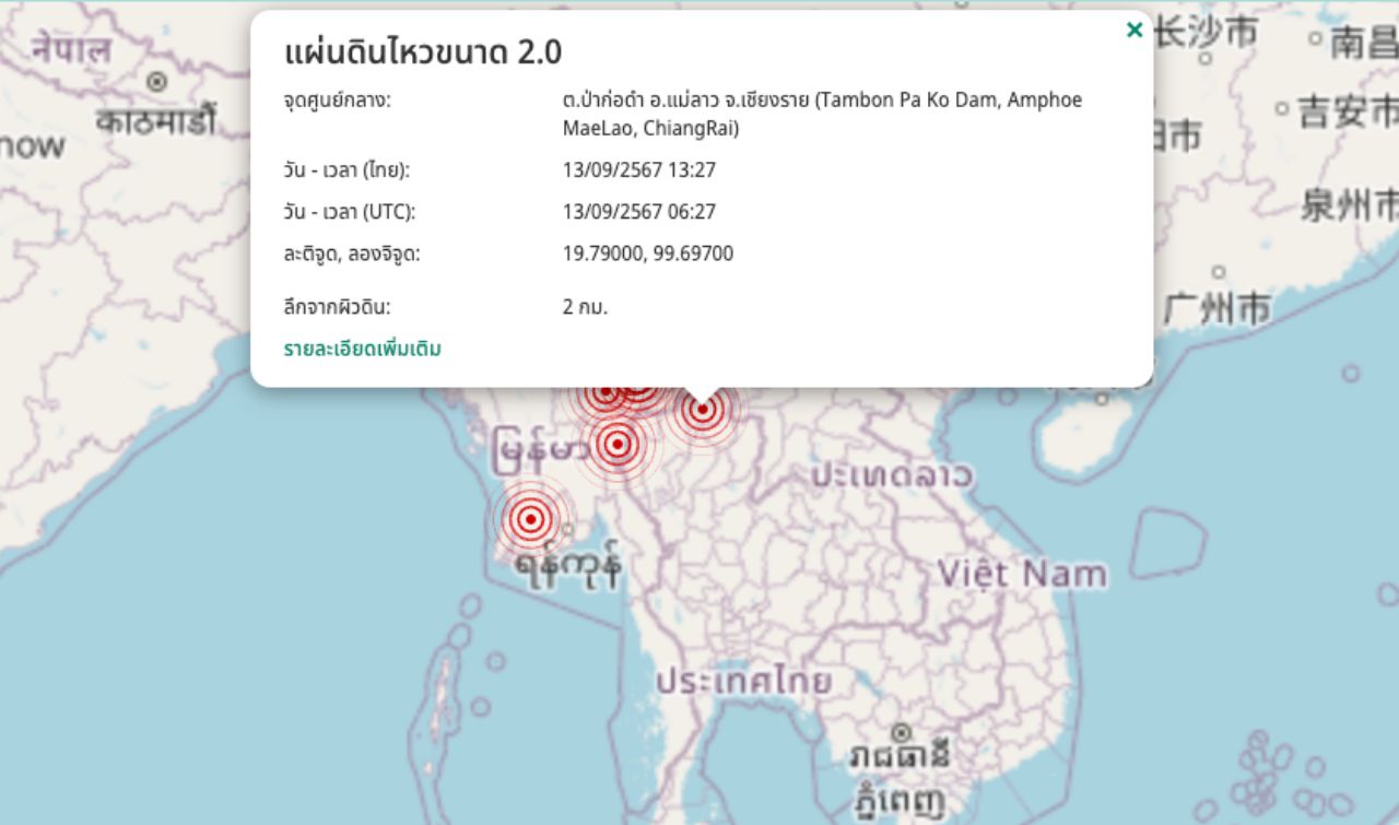 "กองเฝ้าระวังแผ่นดินไหว" รายงานเหตุ "แผ่นดินไหว" บริเวณตำบลป่าก่อดำ อำเภอแม่ลาว จังหวัดเชียงราย ขนาด 2.0 ความลึก 2 กิโลเมตร