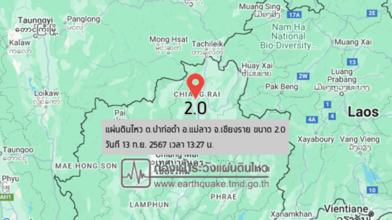 เมื่อเวลา 13.27 น. วันที่ 13 กันยายน 2567 กองเฝ้าระวังแผ่นดินไหว รายงานว่าเกิดเหตุแผ่นดินไหวที่บริเวณตำบลป่าก่อดำ อำเภอแม่ลาว จังหวัดเชียงราย ขนาด 2.0 ความลึก 2 กิโลเมตร เบื้องต้นยังไม่มีการรายงานความเสียหายและยังไม่มีการแจ้งรู้สึกถึงแรงสั่นสะเทือนของแผ่นดินไหวในครั้งนี้