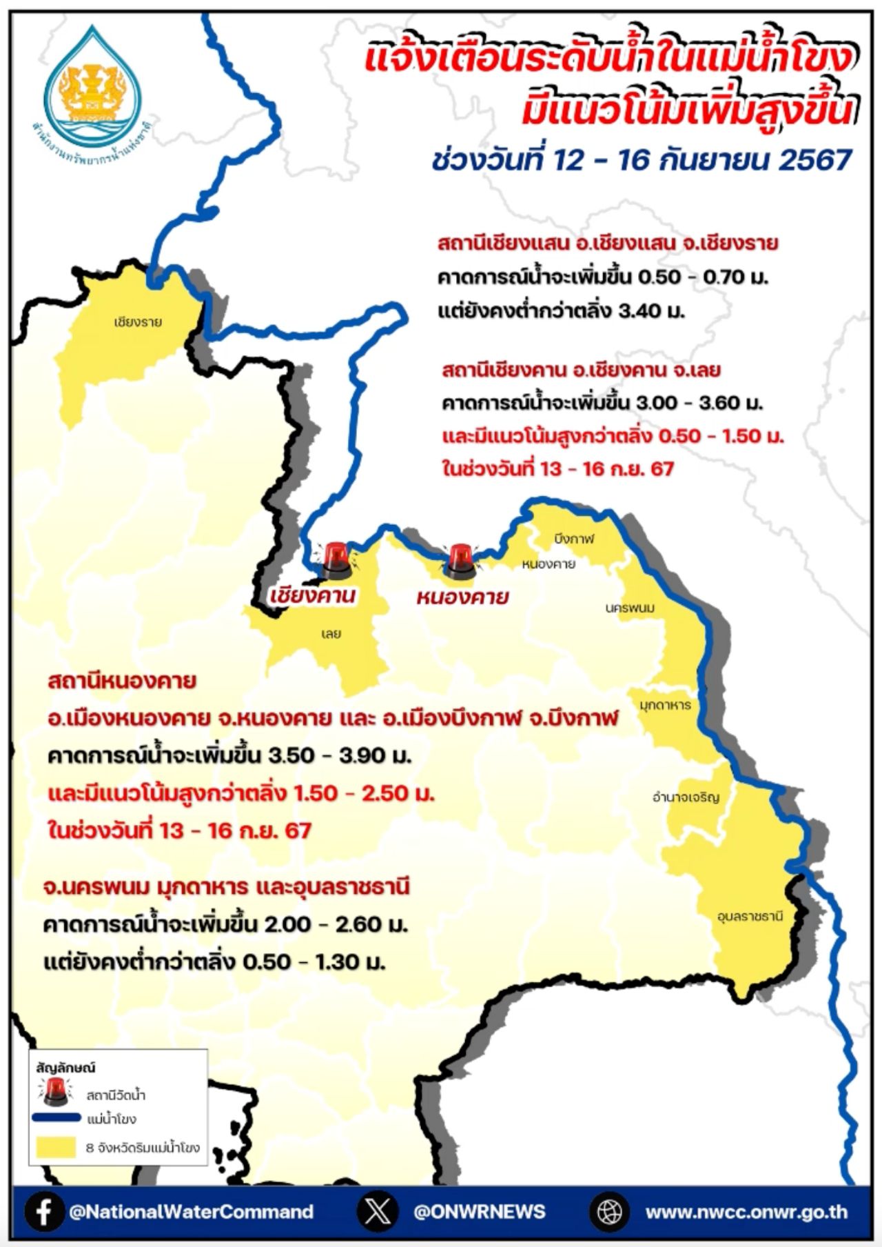 วันที่ 15 กันยายน 2567 ผู้สื่อข่าวรายงานว่าหลังจากที่ สำนักงานทรัพยากรน้ำแห่งชาติ (สนทช.) ได้มีการออกมาเตือนให้เฝ้าระวังระดับน้ำโขงที่เพิ่มขึ้นในช่วงวันที่ 14-16 กันยายน ล่าสุดระดับน้ำโขง 07.00 น. ที่อำเภอโขงเจียมอยู่ที่ 11.85 เมตร เพิ่มขึ้นจากเมื่อวาน 90 เซนติเมตร ต่ำกว่าตลิ่ง 2.65 เมตร