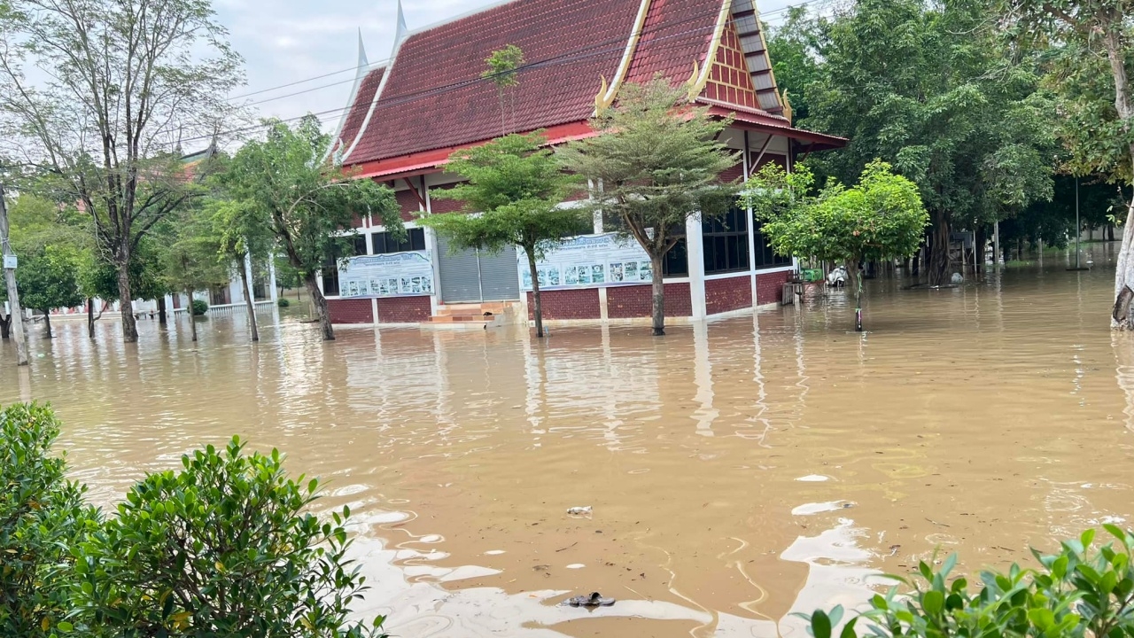 สุโขทัย สถานการณ์น้ำจากคลองแม่ลำพัน ล้นตลิ่งทะลักท่วมวัดกำแพงงาม อ.เมืองสุโขทัย บางจุดสูงกว่า 1.50 เมตร พระและเณรได้รับความเดือดร้อน บิณฑบาตไม่ได้