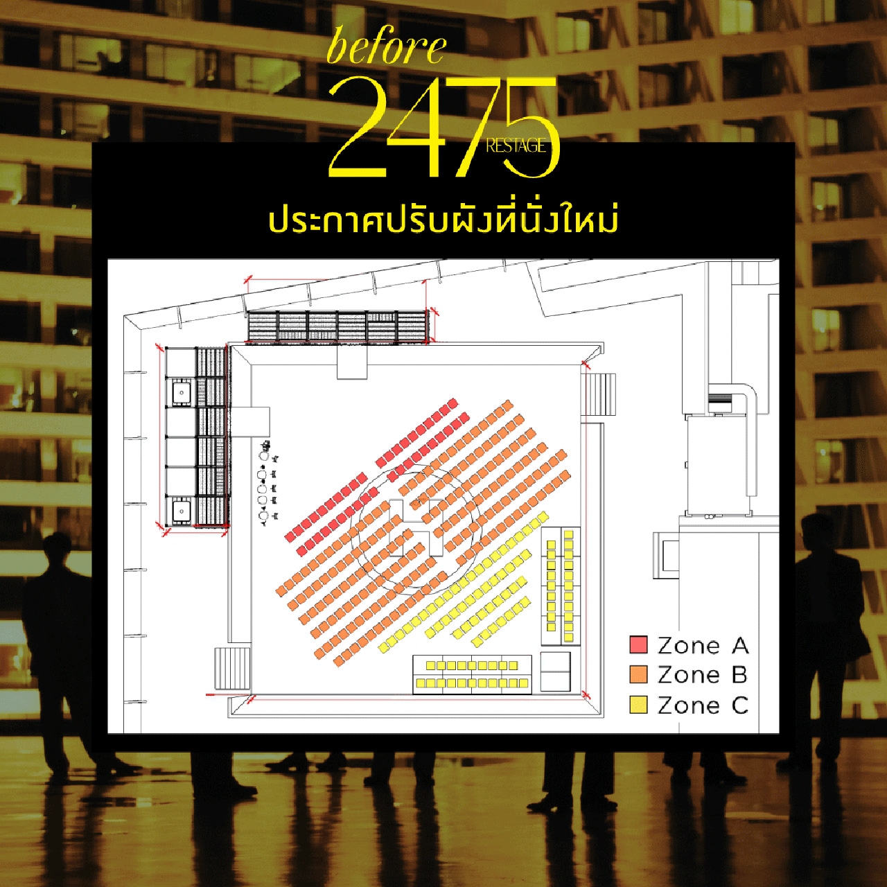 ละครเวทีเรื่อง “before 2475 Restage” มีความยาว 120 นาที พร้อมคำบรรยายเป็นภาษาอังกฤษ โดยได้แบ่งที่นั่งออกเป็นทั้งหมด 3 ส่วนคือ โซน A (สำหรับบัตรเข้าชมราคา 2,475 บาท) โซน B (สำหรับบัตรเข้าชมราคา 1,500 บาท) และโซน C (สำหรับบัตรเข้าชมราคา 900 บาท)