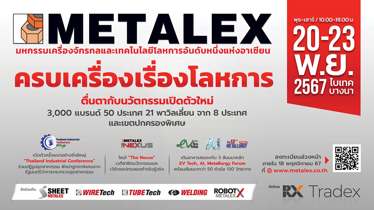 แล้วพบกันที่งาน เมทัลเล็กซ์ 2024 ณ ฮอลล์ 98-104 ศูนย์นิทรรศการและการประชุมไบเทค ระหว่างวันที่ 20-23 พฤศจิกายน 2567 เวลา 10.00-18.00 น. สอบถามข้อมูลเพิ่มเติมได้ที่ โทร. 0 2686 7222 หรืออีเมล contactcenter@rxtradex.com