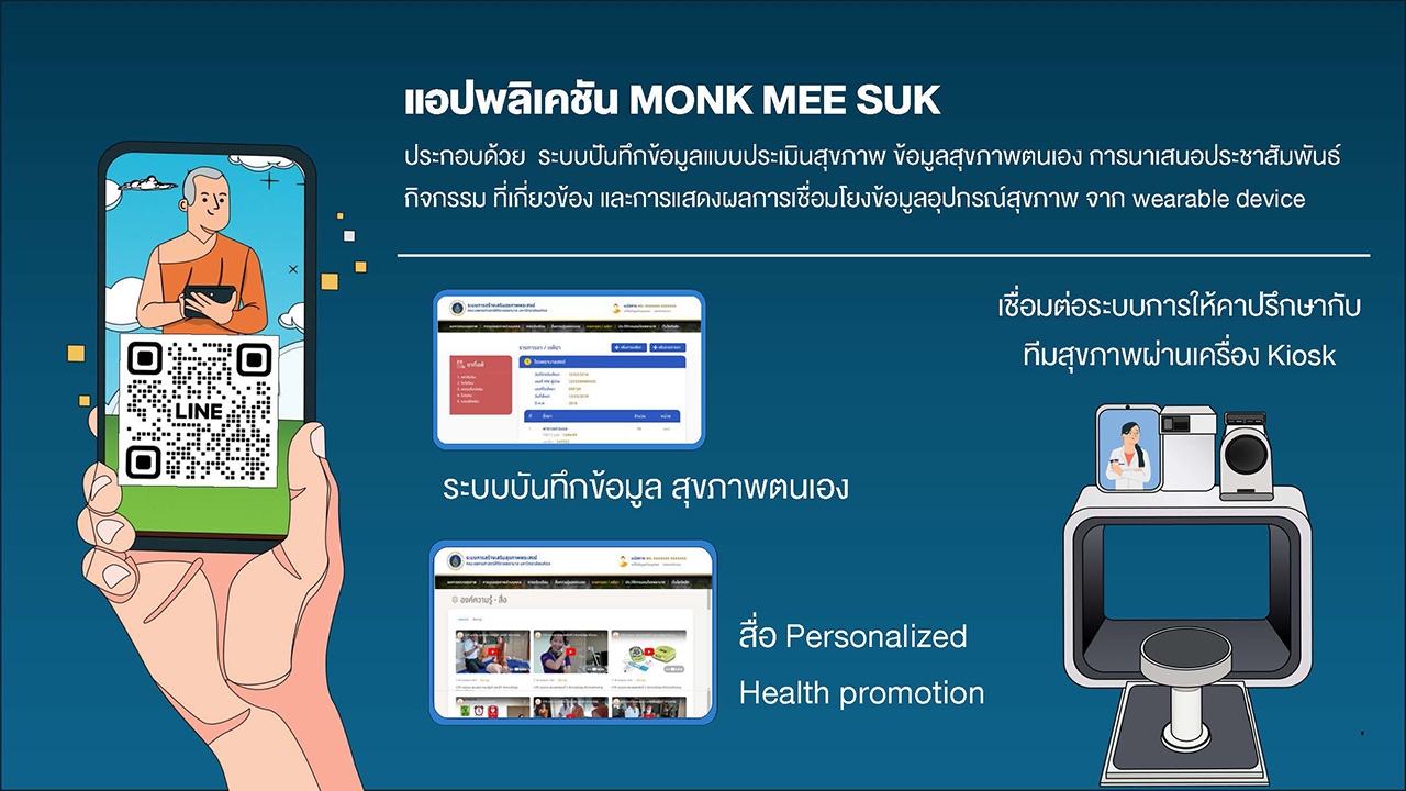 โดยมีการดำเนินโครงการด้วยการพัฒนาแอปพลิเคชันและเว็บแอปพลิเคชันสำหรับบันทึกข้อมูลสุขภาพ กิจกรรมตรวจสุขภาพพระสงฆ์ กิจกรรมเครื่องตรวจสุขภาพด้วยตนเอง Health station at temple กิจกรรมพัฒนาฐานข้อมูลและระบบ Telemedicine ผลิตสื่อให้ความรู้ด้านการแพทย์แผนไทย เพื่อเสริมสร้างสุขภาพพระสงฆ์ อบรมเผยแพร่ความรู้เพื่อเสริมสร้างสุขภาพพระสงฆ์ในเขตเมือง ส่งเสริมความรู้ด้านโภชนาการสำหรับภิกษุสงฆ์และแม่ครัววัด ส่งเสริมสุขภาพพระสงฆ์โดยการใช้อุปกรณ์ Wearable สำหรับวัดอัตราการเต้นของหัวใจและระดับปริมาณกิจกรรมทางกายสำหรับพระสงฆ์ ซึ่งพระสงฆ์สามารถเข้าถึงข้อมูลสุขภาพของตนเองได้ผ่าน Mobile Application ชื่อ MONK MEE SUK ซึ่งบางกอกน้อยโมเดลจัดทำเป็นโครงการต้นแบบเพื่อขยายสู่พื้นที่อื่นๆ ต่อไป