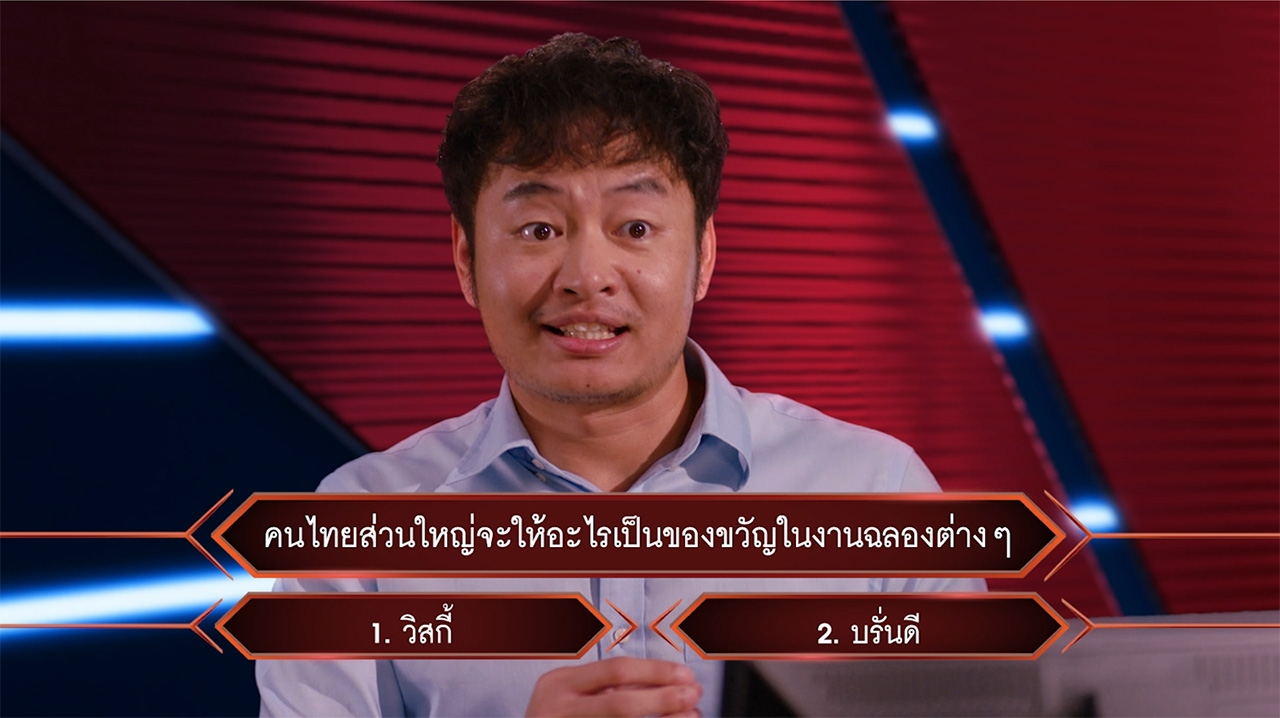 การสื่อสารปีนี้ ได้นำรูปแบบเกมโชว์ท้าทายความสามารถในการตอบคำถามเพื่อชิงเงินรางวัล 1 ล้านบาท มาสร้างความน่าสนใจ น่าติดตามให้กับกลุ่มเป้าหมาย ด้วยคำถามชิงเงินล้านที่ว่า “คนไทยส่วนใหญ่จะให้อะไรเป็นของขวัญในงานฉลองต่างๆ โดยมีตัวเลือกที่ 1 วิสกี้ ตัวเลือกที่ 2 บรั่นดี” คำถามนี้มีทั้งครอบครัว ภรรยา และลูก ของผู้เข้าแข่งขันที่รอลุ้นถ้าหากผู้เข้าแข่งขันตอบจะได้รางวัลเงินล้านไปใช้กับลูกและภรรยา ซึ่งการตอบคำตอบในหนังโฆษณานี้จะสร้างการจดจำ และเซอร์ไพรส์ให้กับคนดูเป็นอย่างแน่ และด้วยคำตอบของผู้แข่งขันจะช่วยตอกย้ำว่าวันนี้ไม่มีใครให้เหล้าเป็นของขวัญกันแล้ว