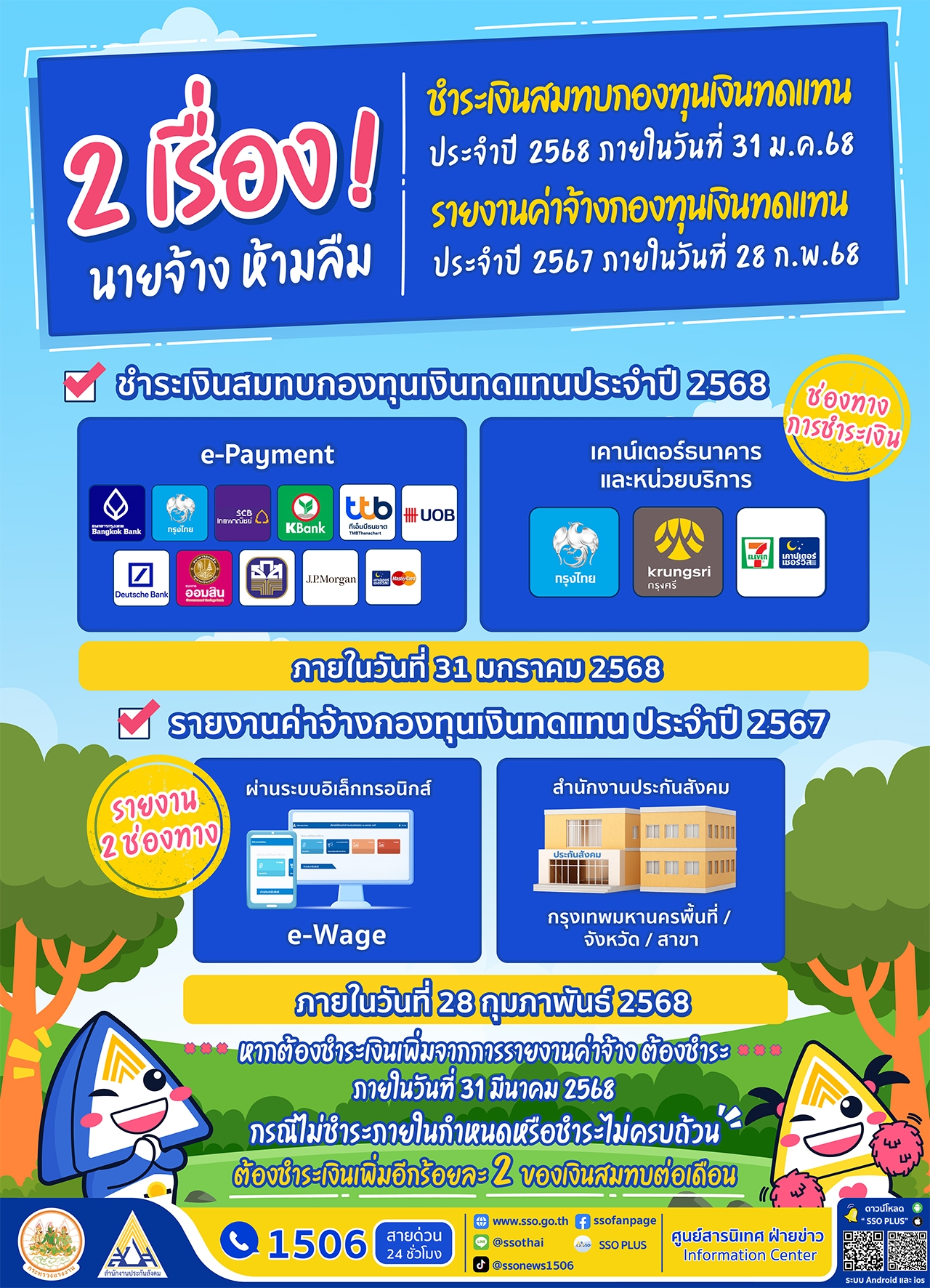 ทั้งนี้ นายจ้างสามารถชำระเงินสมทบประจำปี 2568 ได้หลายช่องทาง ได้แก่ 1. ผ่านเคาน์เตอร์ธนาคารและหน่วยบริการ ธนาคารกรุงไทย จำกัด (มหาชน) ธนาคารกรุงศรีอยุธยา จำกัด (มหาชน) เคาน์เตอร์เซอร์วิส 2. ผ่านระบบอิเล็กทรอนิกส์ (e-Payment) บนเว็บไซต์สำนักงานประกันสังคม (www.sso.go.th) ผ่านธนาคาร/หน่วยบริการที่สามารถรับชำระเงินสมทบพร้อมเงินเพิ่มตามกฎหมาย (ถ้ามี) ได้แก่ ธนาคารกรุงเทพ จำกัด (มหาชน) ธนาคารกรุงไทย จำกัด (มหาชน) ธนาคารทหารไทยธนชาต จำกัด (มหาชน) ธนาคารกสิกรไทย จำกัด (มหาชน) ธนาคารไทยพาณิชย์ จำกัด (มหาชน) ธนาคารออมสิน ธนาคารเพื่อการเกษตรและสหกรณ์การเกษตร ธนาคารยูโอบี จำกัด (มหาชน) ธนาคารดอยซ์แบงก์ ธนาคารเจพีมอร์แกน เชส และที่เคาน์เตอร์เซอร์วิส (7-11) 3. ชำระเป็นเงินสดหรือส่งเช็คเงินสดทางไปรษณีย์แบบลงทะเบียนตอบรับ หรือส่งธนาณัติสั่งจ่ายไปที่สำนักงานประกันสังคมกรุงเทพมหานครพื้นที่/จังหวัด/สาขา