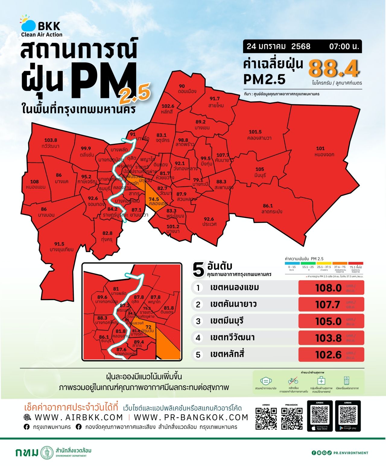 เมื่อวันที่ 24 มกราคม 2568 ศูนย์ข้อมูลคุณภาพอากาศกรุงเทพมหานคร รายงานสถานการณ์ฝุ่นละอองขนาดไม่เกิน 2.5 ไมครอน (PM2.5) ในกรุงเทพมหานคร ประจำวันที่ 24 มกราคม 2568 เวลา 07:00 น.