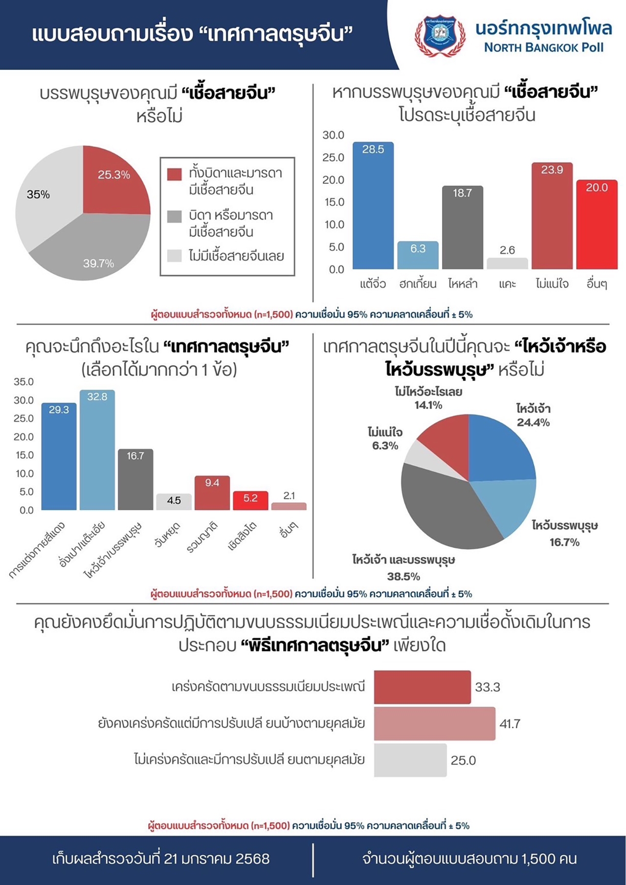 ผศ.ดร.สานิต ศิริวิศิษฐ์กุล ศูนย์สำรวจความคิดเห็น “นอร์ทกรุงเทพโพล” เปิดเผยผลจากการสำรวจความคิดเห็นของประชาชนต่อเทศกาลตรุษจีน ในวันที่ 21-24 มกราคม 2568 จำนวนตัวอย่าง 1,500 ตัวอย่าง จากประชาชนทุกภูมิภาคทั่วประเทศ ที่ค่าความเชื่อมั่นร้อยละ 95 บรรพบุรุษมีเชื้อสายจีนหรือไม่ พบว่าทั้งบิดาและมารดามีเชื้อสายจีนร้อยละ 25.3 บิดาหรือมารดามีเชื้อสายจีน ร้อยละ 39.7 และไม่มีเชื้อสายจีน ร้อยละ 35.0