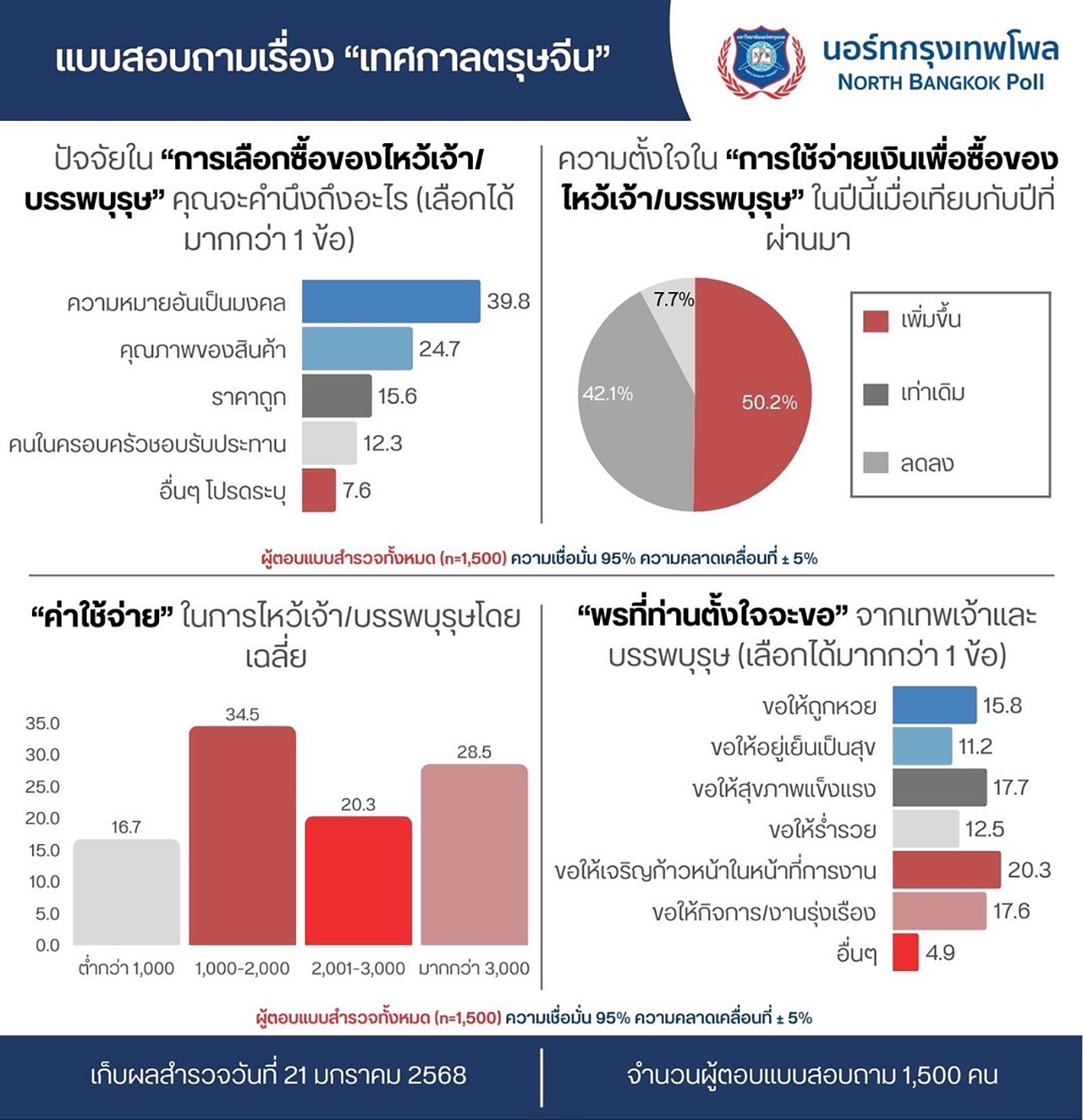 ความตั้งใจในการใช้จ่ายเงินเพื่อซื้อของไหว้เจ้า/บรรพบุรุษ พบว่าตั้งใจใช้จ่ายเพิ่มขึ้นร้อยละ 50.2 เท่าเดิม ร้อยละ 42.1 และใช้จ่ายลดลง ร้อยละ 7.7