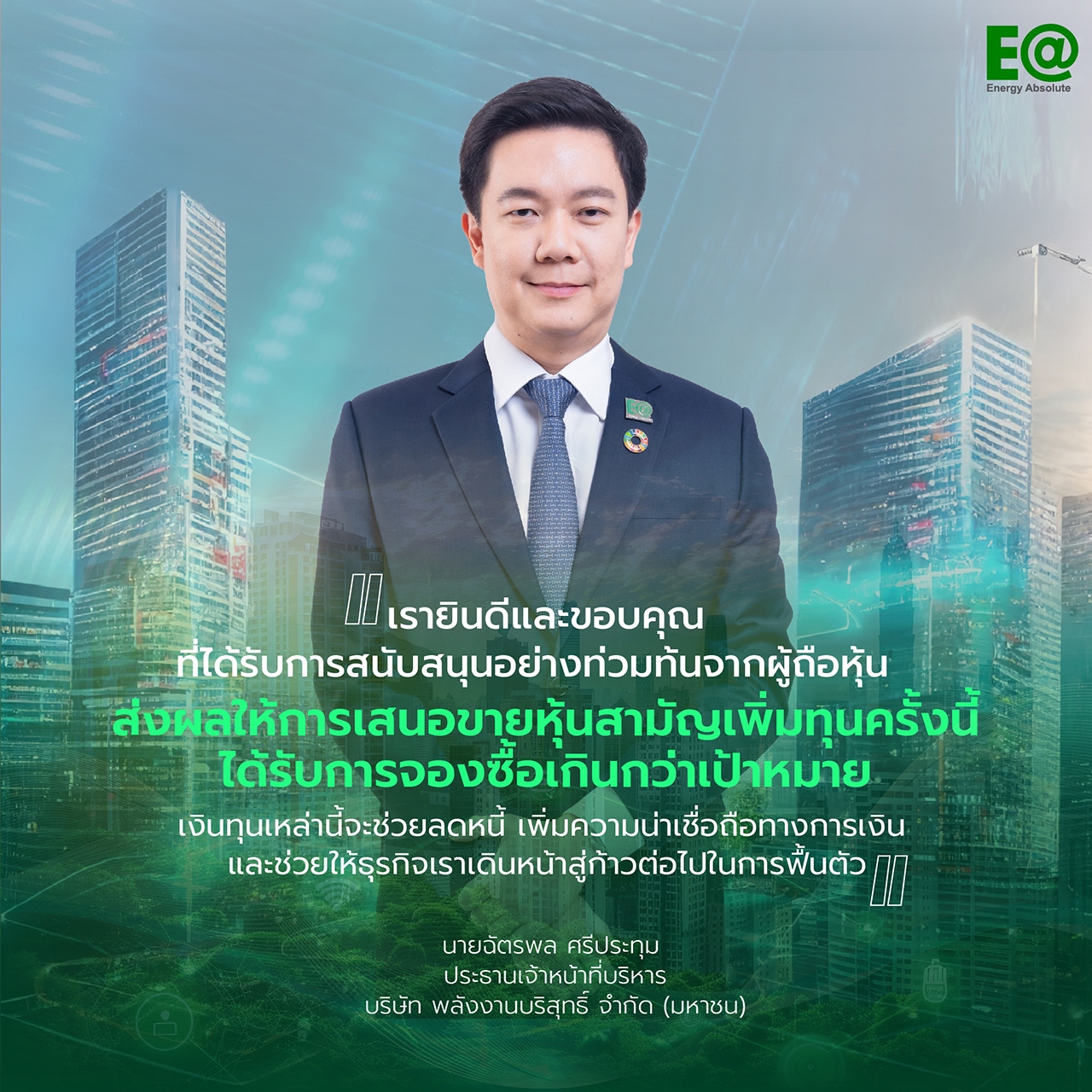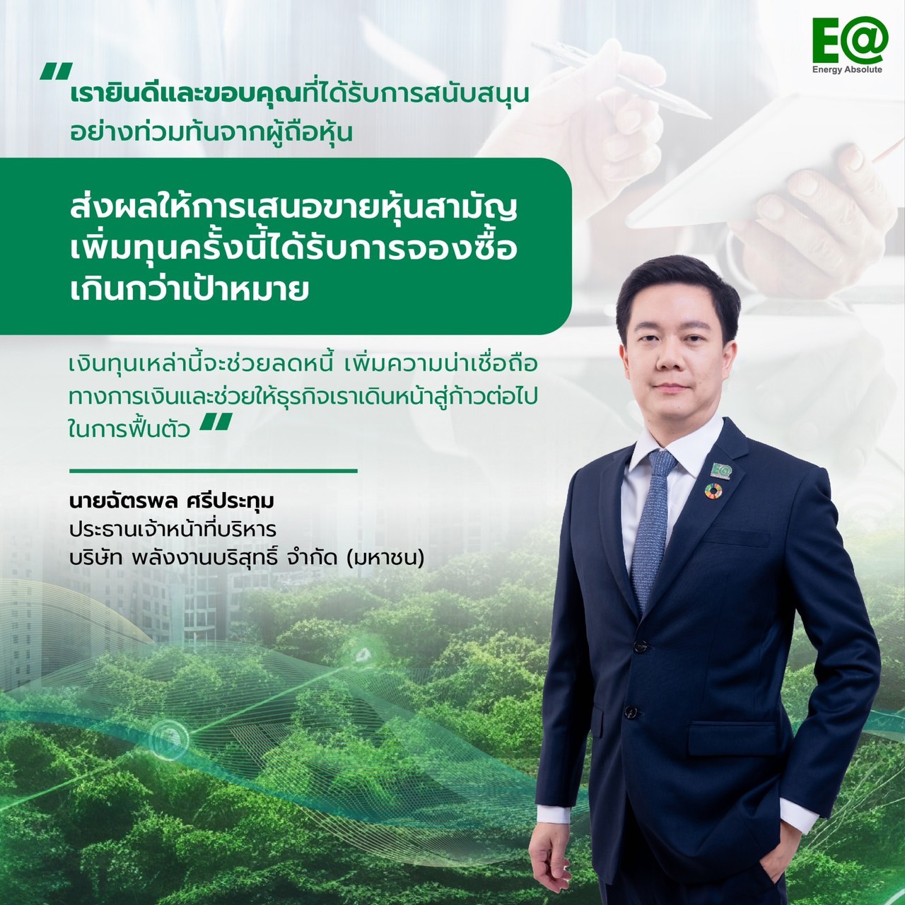 กรุงเทพฯ (28 มกราคม 2568) – บริษัท พลังงานบริสุทธิ์ จำกัด (มหาชน) (EA) หนึ่งในธุรกิจพลังงานทดแทนชั้นนำของประเทศ ประกาศในวันนี้ว่า แผนการพลิกฟื้นธุรกิจได้รับการสนับสนุนอีกครั้งอย่างท่วมท้น จากความสำเร็จของการเสนอขายหุ้นสามัญเพิ่มทุนในช่วงวันที่ 17-23 มกราคม 2568 โดยมีการจองซื้อเกินกว่าเป้าหมาย สามารถระดมทุนได้ทั้งสิ้น 7,426 ล้านบาท