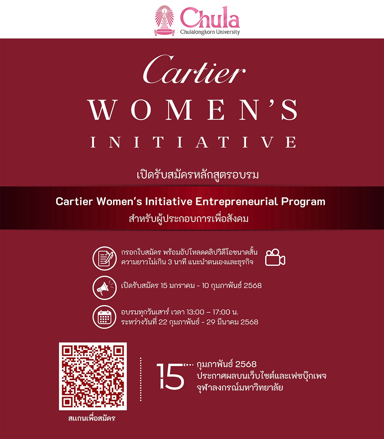 คาร์เทียร์ ประเทศไทย ประกาศโค้งสุดท้ายของการเปิดรับสมัครผู้เข้าร่วมอบรมหลักสูตร Cartier Women’s Initiative (CWI) Entrepreneurial Program หลักสูตรอบรมผู้ประกอบการเพื่อสังคมชาวไทย ที่มุ่งเน้นการส่งมอบโซลูชันในการแก้ไขปัญหาสังคมด้านต่างๆ และสิ่งแวดล้อม ผ่านผลิตภัณฑ์และบริการของธุรกิจ (ทำธุรกิจที่ตอบโจทย์เป้าหมายด้านความยั่งยืนของสหประชาชาติอย่างน้อย 1 ข้อ) นับเป็นครั้งแรกที่คาร์เทียร์ ประเทศไทย สานต่อโครงการ CWI ในระดับประเทศ จับมือ จุฬาลงกรณ์มหาวิทยาลัย พัฒนาหลักสูตร CWI Entrepreneurial Program สำหรับผู้ประกอบการเพื่อสังคม ที่ดำเนินธุรกิจในระยะเริ่มต้น (ไม่เกิน 6 ปี) เพื่อเสริมความรู้และพัฒนาทักษะที่จำเป็นให้แก่ผู้ประกอบการเพื่อสังคมโดยเฉพาะ ให้สามารถดำเนินธุรกิจได้อย่างยั่งยืน ต่อยอดสร้างการเติบโตสู่ระดับนานาชาติ และสามารถเข้าร่วมแข่งขันโครงการ Cartier Women’s Initiative ระดับโลกได้ในอนาคต การอบรมหลักสูตร CWI Entrepreneurial Program (เปิดรับสมัครตั้งแต่ 15 ม.ค. – 10 ก.พ.) จะปิดรับสมัครออนไลน์ ถึงเที่ยงคืน วันจันทร์ ที่ 10 กุมภาพันธ์ โดยกรอกใบสมัคร พร้อมอัปโหลดคลิปวิดีโอขนาดสั้น ความยาวไม่เกิน 3 นาที แนะนำตนเองและธุรกิจเพื่อสังคมที่ลิงก์นี้: สมัครเข้าร่วมอบรม หลักสูตร CWI Entrepreneurial Program ประกาศผลผู้มีสิทธิ์เข้าร่วมอบรมใน วันเสาร์ที่ 15 กุมภาพันธ์ พ.ศ. 2568 ผ่านทางเว็บไซต์และเฟซบุ๊กเพจของจุฬาลงกรณ์มหาวิทยาลัย (www.chula.ac.th และ www.facebook.com/ChulalongkornUniversity) อบรมระยะสั้น 6 ครั้ง ทุกวันเสาร์ เวลา 13:00 น. – 17:00 น. ระหว่างวันที่ 22 กุมภาพันธ์ – 29 มีนาคม พ.ศ. 2568 ณ โถงชั้น 7 อาคารมหาธีรราชานุสรณ์ สำนักงานวิทยทรัพยากร จุฬาลงกรณ์มหาวิทยาลัย