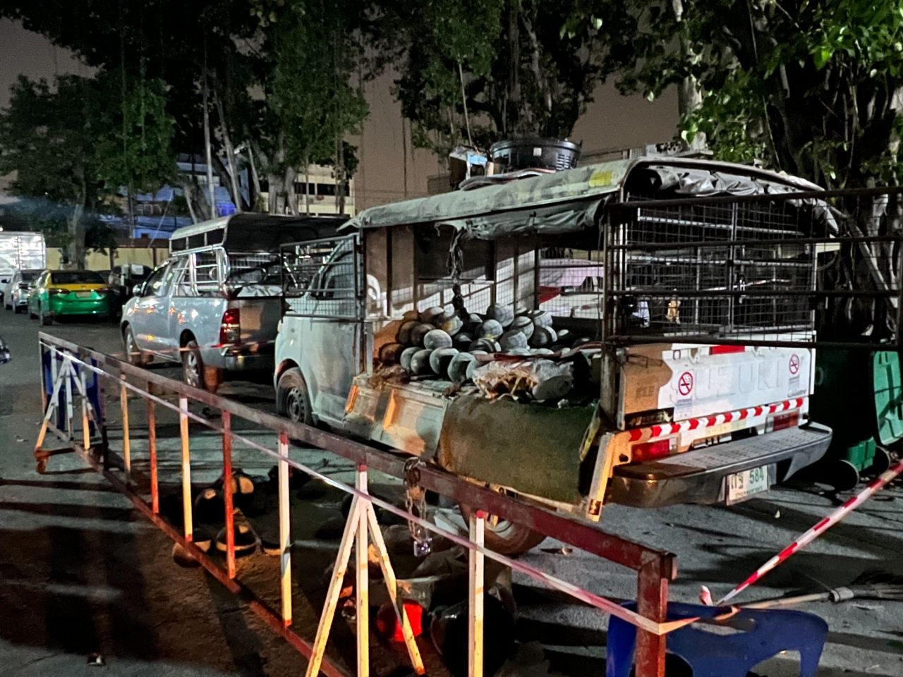 ที่เกิดเหตุอยู่บริเวณลานจอดรถใกล้พระอุโบสถ พบรถยนต์ซูซูกิ รุ่นแครี่ 2 ประตู สีขาว ทะเบียนกรุงเทพมหานคร ติดลูกกรงเสริมรอบคันใช้สำหรับบรรทุกแตงโม มีร่องรอยเกิดเพลิงลุกไหม้บริเวณประตูฝั่งซ้าย ชาวบ้านผู้เห็นเหตุการณ์รีบนำถังดับเพลิงชนิดผงเคมีแห้งมาช่วยกันระดมฉีดดับไฟ